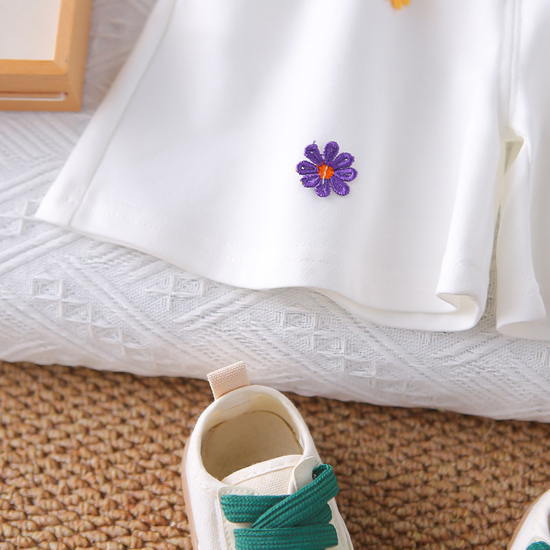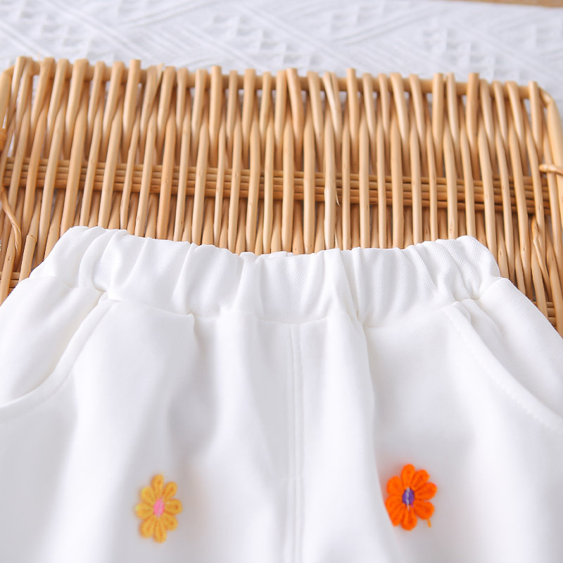 -Pantaloni scurți cu broderii florale 3D – eleganți și comozi, acești pantaloni albi impresionează prin croiala ușor evazată și detaliile fine. Decorați cu numeroase floricele brodate în relief, oferă o notă jucăușă și completează aspectul de basm al setului. Talie elastică pentru confort și îmbrăcare ușoară.