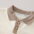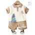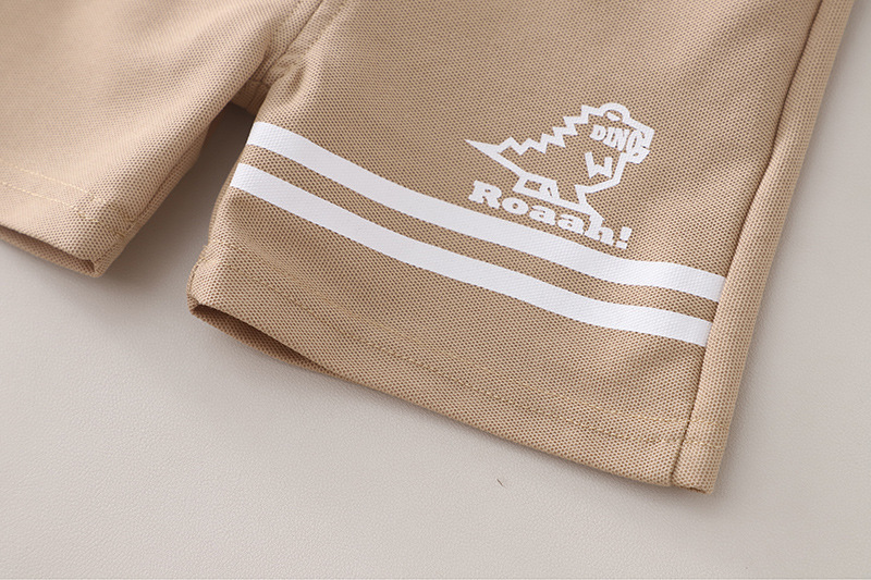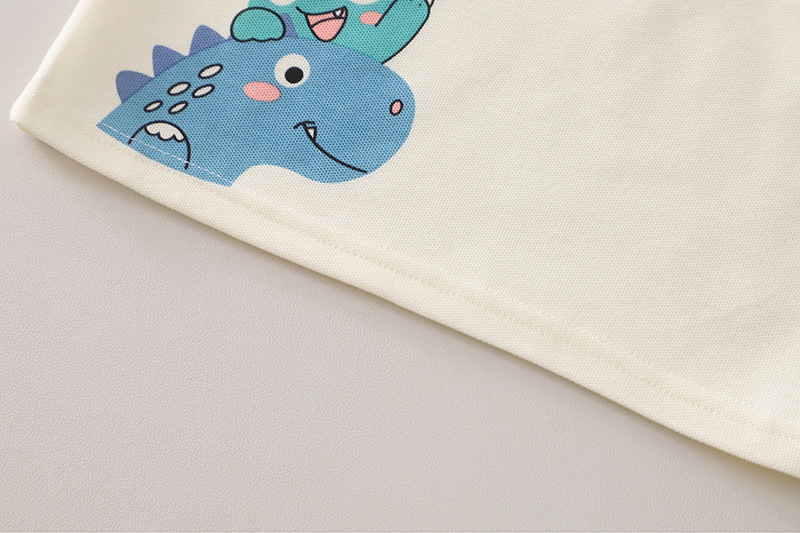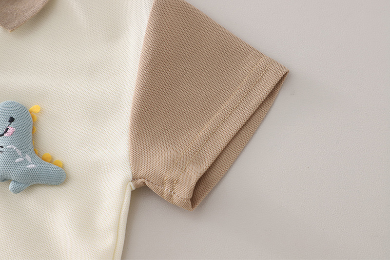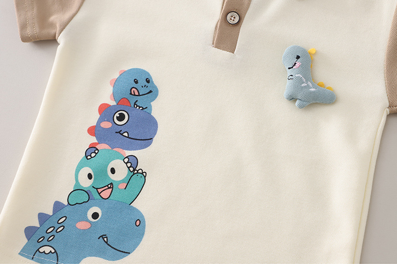 – Tricou tip polo, confecționat din material lacoste de înaltă calitate, într-o nuanță crem deschis. Modelul are guler și mâneci în culoare bej, contrastante, și se încheie cu nasturi în față. Accentul este dat de imprimeul colorat cu dinozauri pe o parte, precum și de o mică aplicație 3D cu dinozaur, care oferă un aspect jucăuș și distinctiv. Croiala este comodă și potrivită pentru joacă activă.
