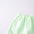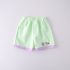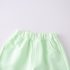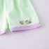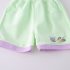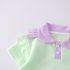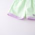 – Pantalon scurt în aceeași nuanță de mentă, realizat din material confortabil. Modelul are talie elastică pentru îmbrăcare ușoară și libertate de mișcare. Partea de jos este finisată cu un tiv mov, care se asortează cu gulerul, iar o mică aplicație completează aspectul.