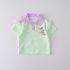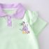 – Tricou tip polo cu mânecă scurtă, confecționat din material lacoste de înaltă calitate, într-o nuanță delicată de mentă. Modelul are guler contrastant în mov și închidere cu nasturi în față. Mânecuțele au o ușoară încrețire, conferind un efect delicat și aerat. Acccentul este o mică aplicație cu inscripția „Lucky Good” și un detaliu jucăuș în față.