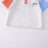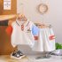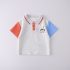 – Tricou confecționat din material lacoste, de culoare gri deschis. Model cu guler clasic și nasturi în contrast, iar mânecile sunt în culori diferite – albastru deschis și cărămiziu, ceea ce oferă un aspect proaspăt și modern. În partea stângă se află o broderie cu un pinguin cu pălărie de petrecere și o inscripție în litere colorate – o adevărată bucurie pentru ochi.