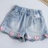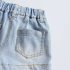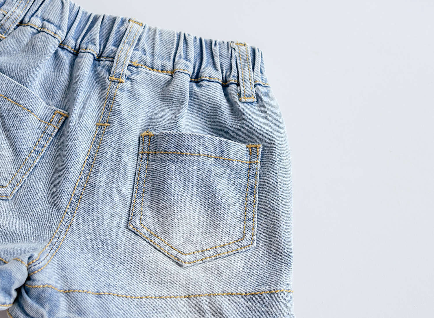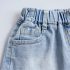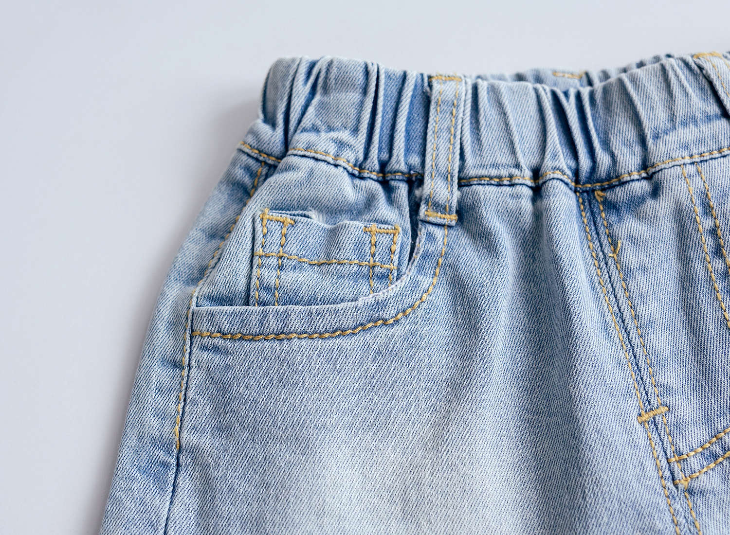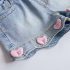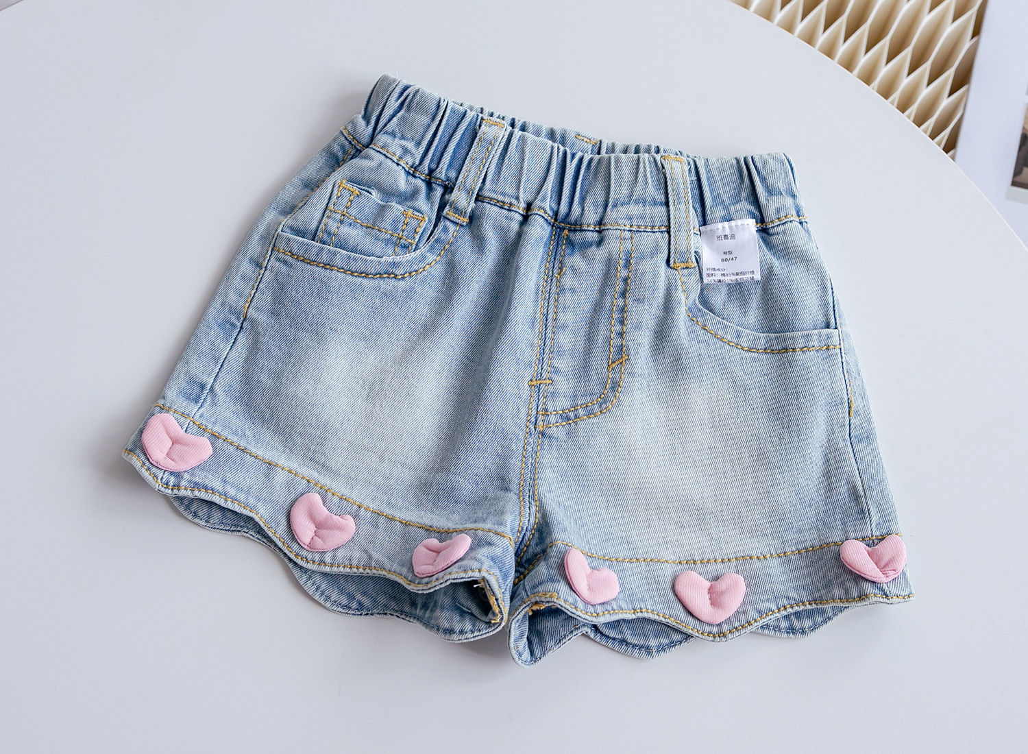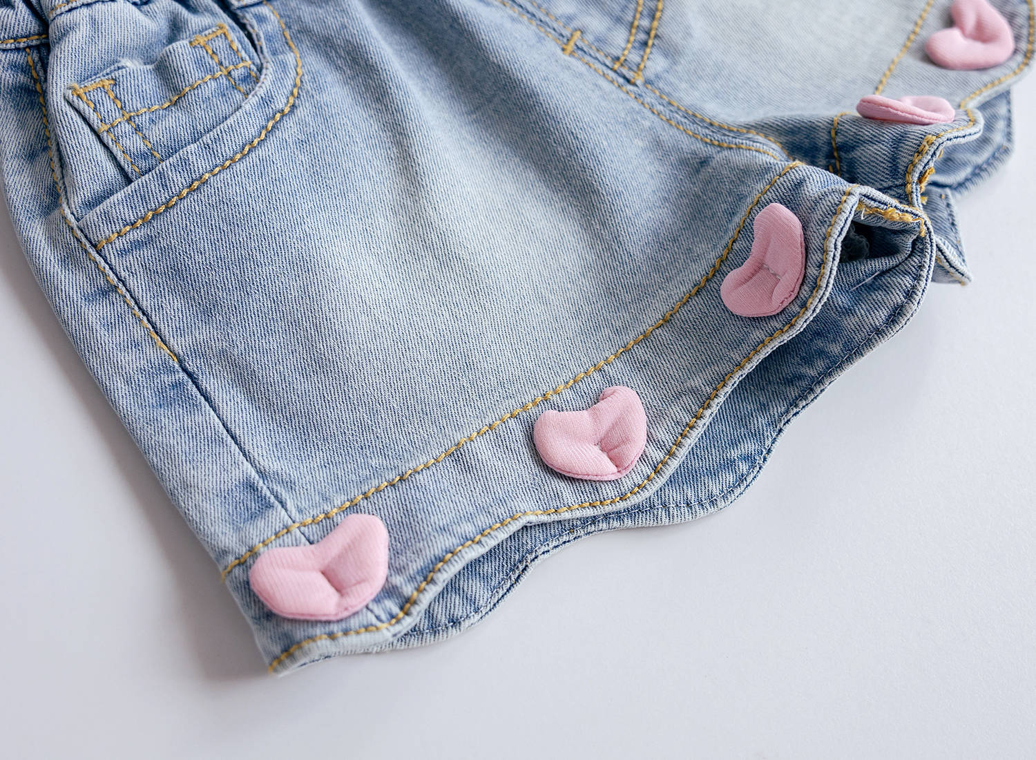 – Pantaloni scurți din denim, într-o nuanță deschisă de albastru, confecționați din material denim moale și confortabil. Modelul are talie elastică pentru o îmbrăcare ușoară și confort sporit. Partea de jos este prevăzută cu tiv în valuri, decorat cu mici inimioare 3D roz, care adaugă un accent dulce și unic. Croiala este comodă și potrivită pentru joacă și plimbări.