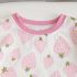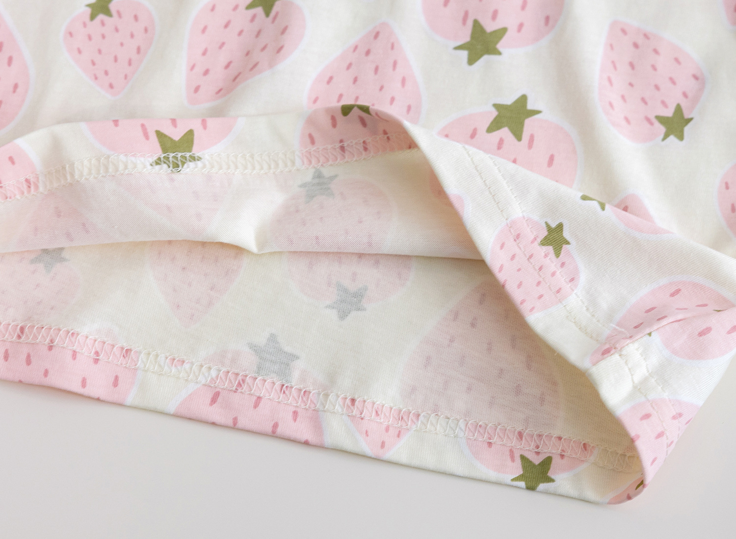 – Tricou cu mânecă scurtă, confecționat din material moale și respirabil din bumbac, într-o nuanță delicată de crem. Modelul are decolteu rotund cu margine roz și croială lejeră, confortabilă. Designul este îmbogățit cu un imprimeu adorabil cu căpșuni în roz pastel, cu accente verzi care aduc un aer proaspăt și vesel de vară.