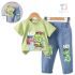– Pantalon din denim cu crac lung, realizat din material moale și confortabil de blugi într-o nuanță deschisă de albastru. Modelul are talie elastică pentru îmbrăcare ușoară. Este completat de un imprimeu cu dinozaur și text lateral, care continuă tema setului și creează un aspect unitar.