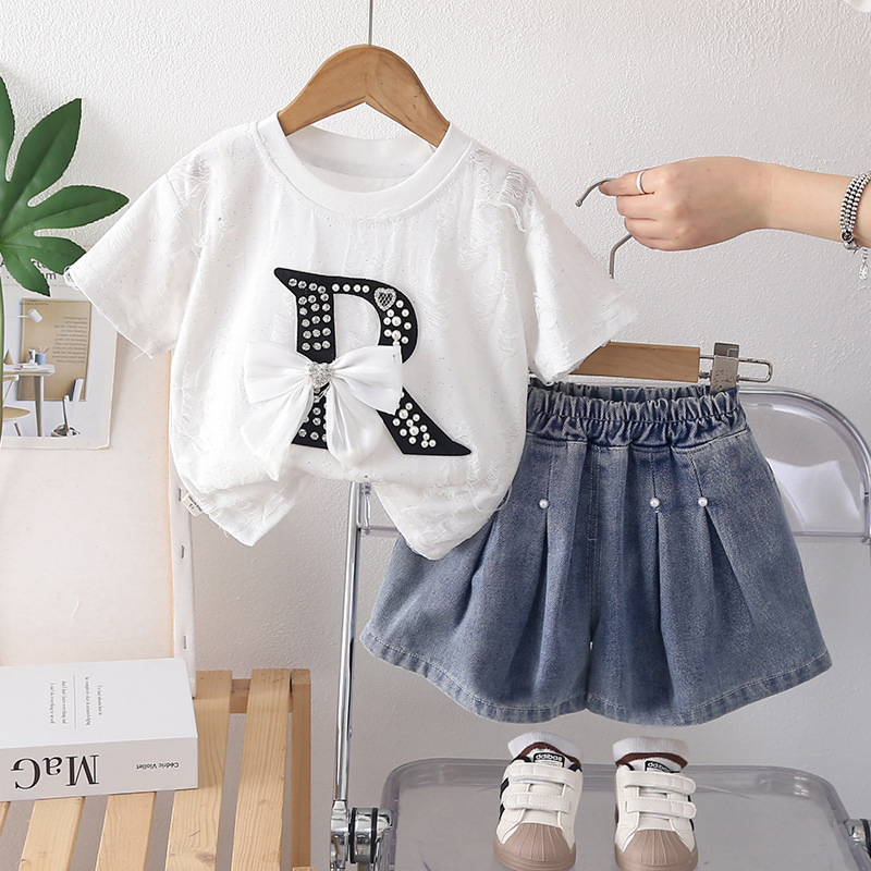 Set de 2 piese din tricou cu relief, elemente 3D și pantaloni scurți din denim Romantic Style White