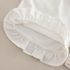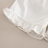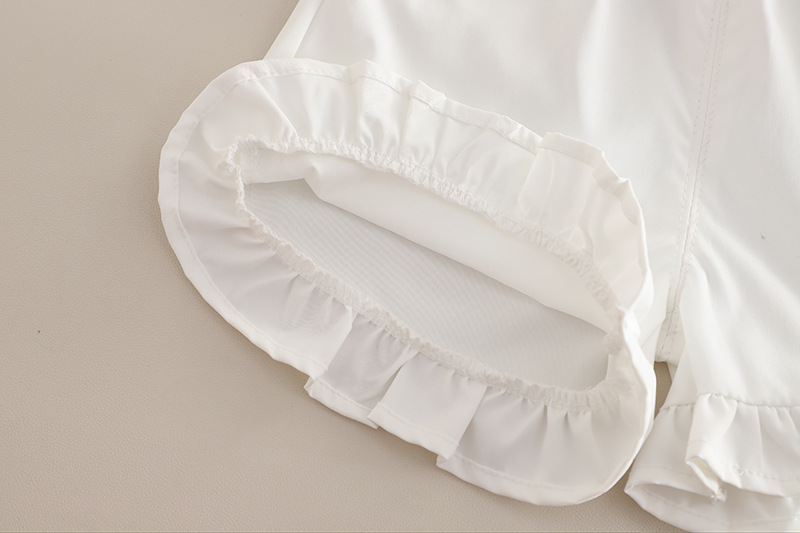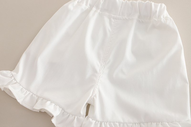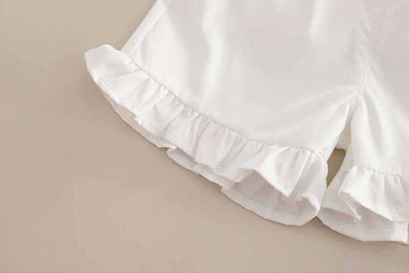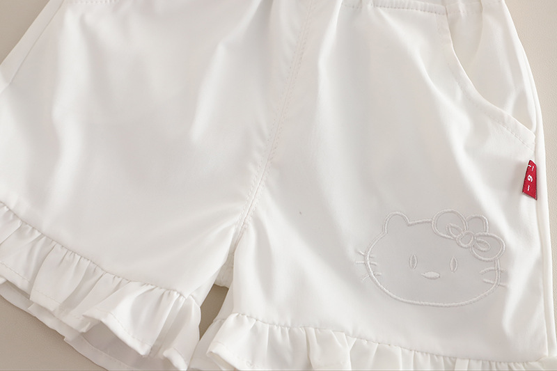 -Pantaloni scurți cu volănașe și broderie, confecționați din material ușor, de culoare albă ca zăpada, cu talie elastică pentru o îmbrăcare ușoară. Partea de jos este decorată cu volănașe elegante, care adaugă un farmec delicat și feminin. Pe lateral este adăugată o broderie discretă cu o pisicuță – un detaliu delicat și stilat care completează tematica părții de sus.
