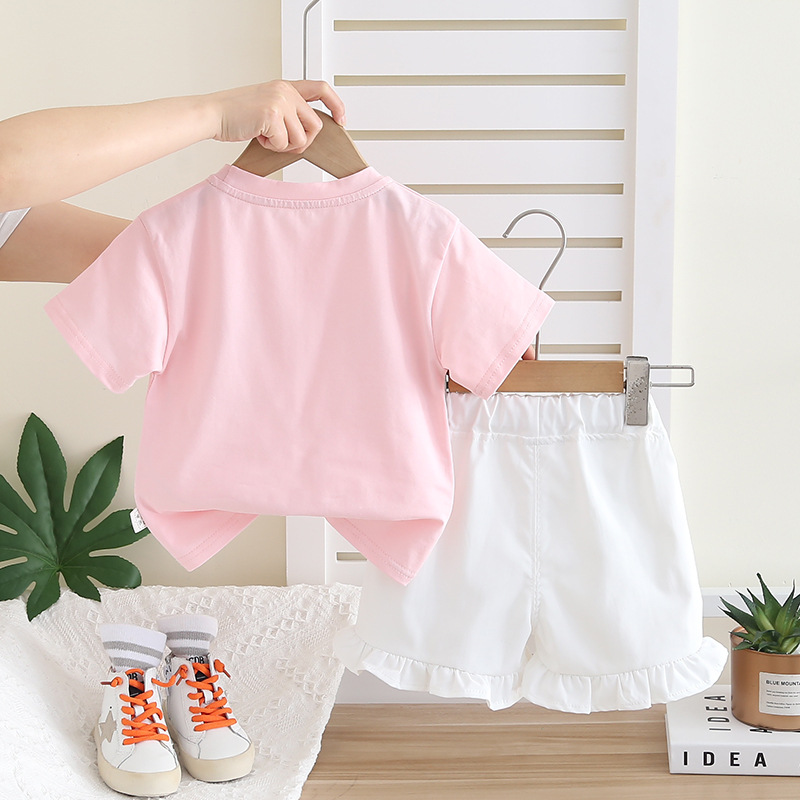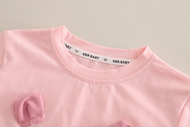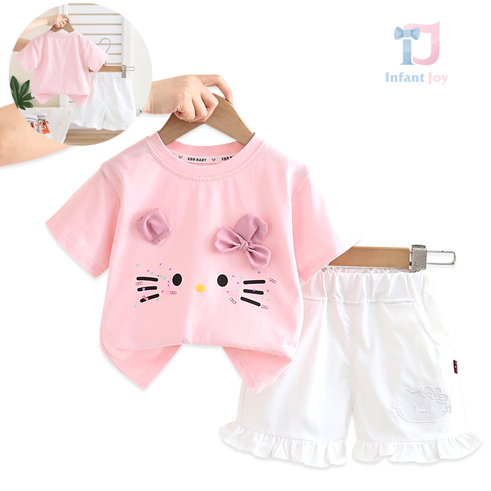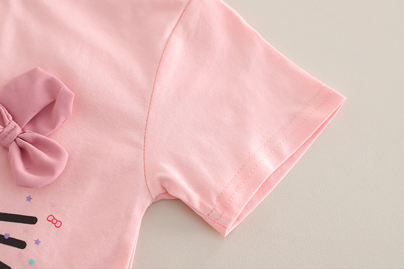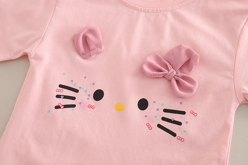 Set de 2 piese din tricou cu urechi 3D și pantaloni scurți cu volane și broderie Kitty Charm Pink