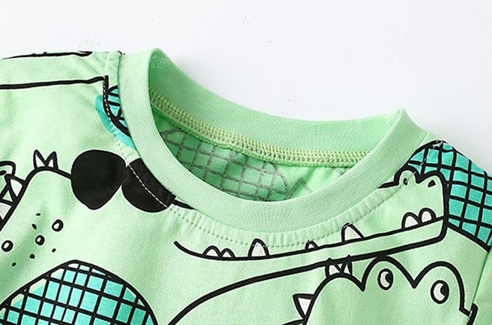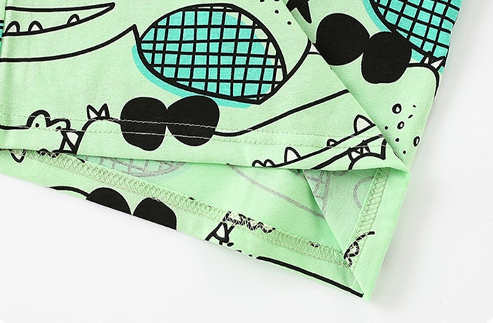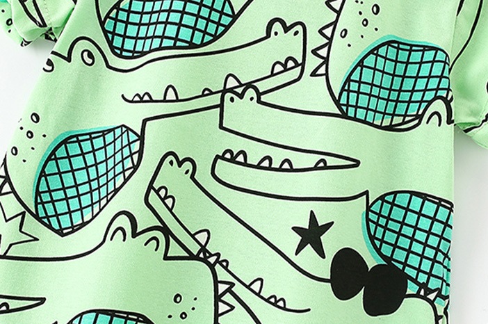-Tricou din bumbac, în culoare verde deschis. Decorat cu ilustrații grafice în negru și albastru cu crocodili purtând ochelari, stele și papioane – un stil amuzant care va aduce zâmbetul pe chipul oricărui copil. Gulerul rotund și croiala clasică facilitează îmbrăcarea.