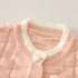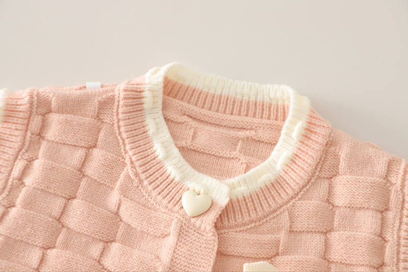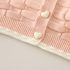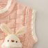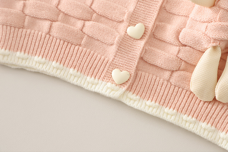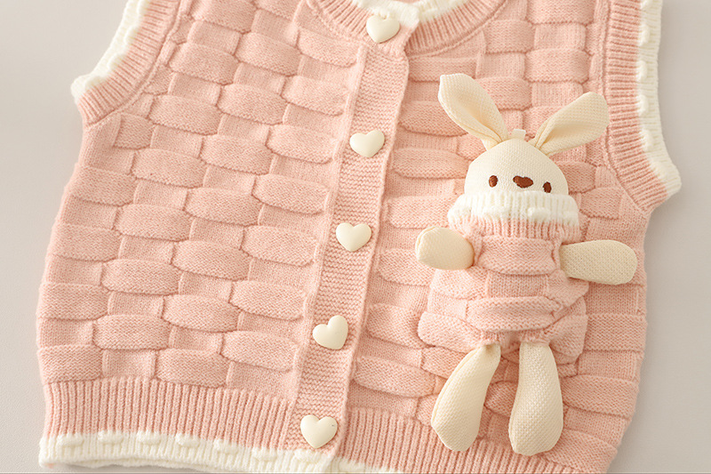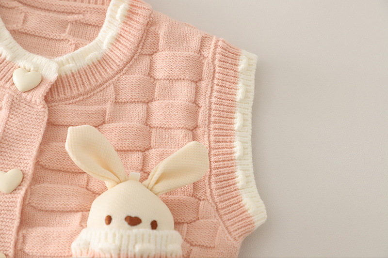 – Vestă tricotată în nuanță roz pudră, confecționată dintr-un tricot fin și moale, cu textură reliefată. Accentul este pus pe aplicația cu un iepuraș drăgălaș, completată de mici nasturi decorativi în formă de inimioară, care oferă modelului un aer jucăuș și romantic.