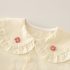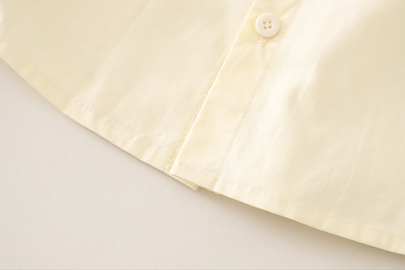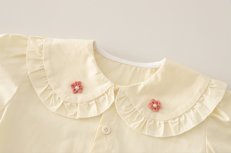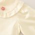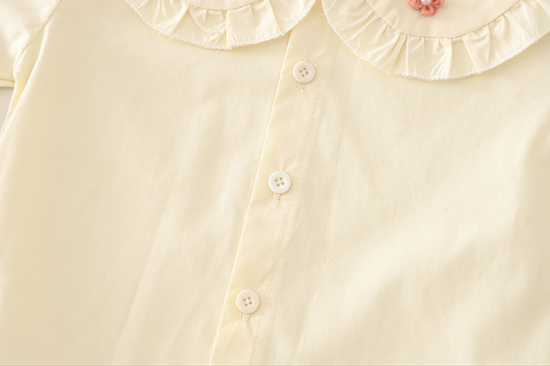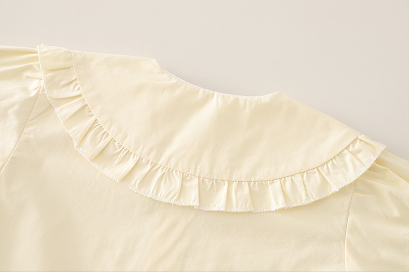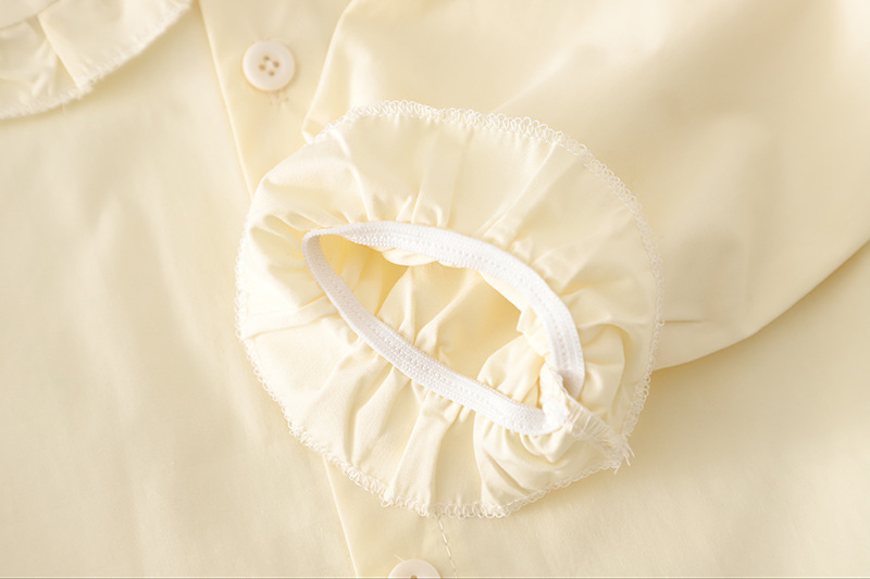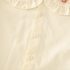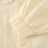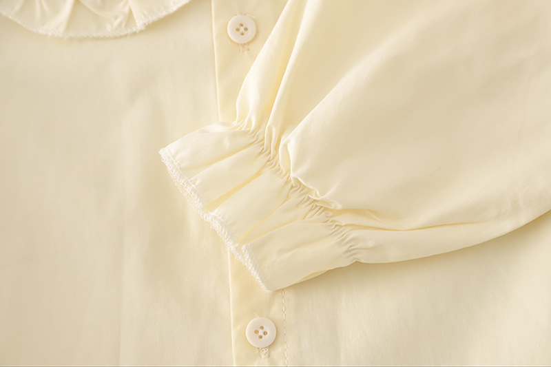 – Cămașă cu mânecă lungă și guler tip Peter Pan, realizată dintr-un material moale și plăcut la atingere, de culoare crem. Modelul are un guler rotunjit cu volane delicate, decorat cu mici aplicații florale, iar mânecile ușor bufante se termină cu volane fine la manșete, adăugând o notă delicată și feminină.