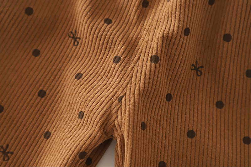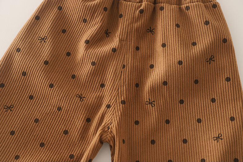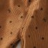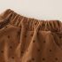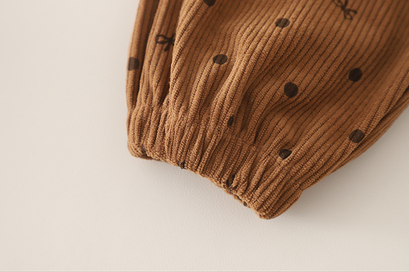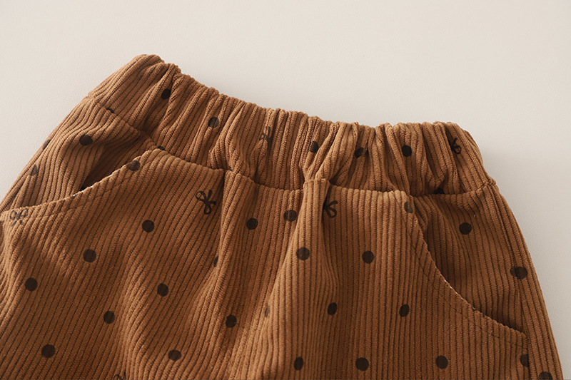 – Pantalon din denim maro, cu talie elastică, manșete elastice în partea de jos și imprimeu decorativ cu puncte mici, care echilibrează look-ul și îl face practic pentru purtare zilnică.