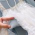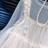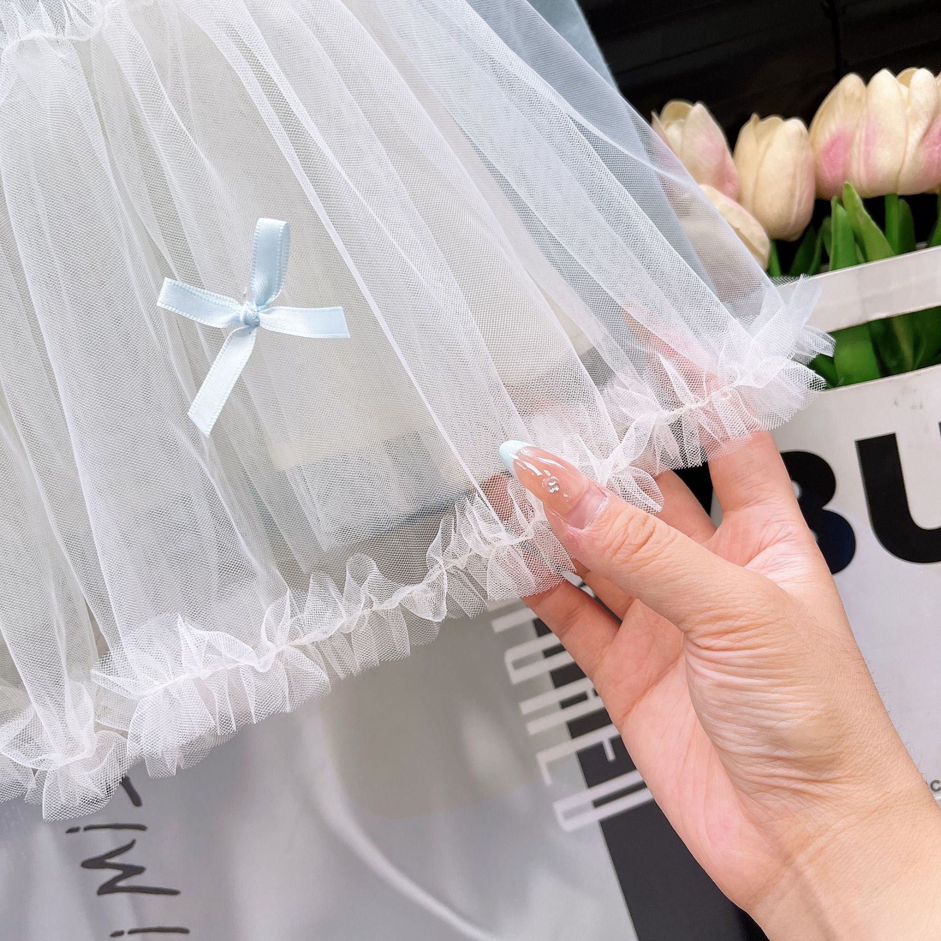 – Top din tulle multistrat în culoare albă, cu croială vaporoasă și amplă. Este decorat cu fundițe mici în nuanță de albastru și volănașe fine pe bretele, care creează un aspect fermecător și foarte delicat. În partea de jos are o căptușeală ușoară pentru confort.