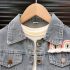 – Jachetă scurtă din denim într-o nuanță deschisă, confecționată din material moale și plăcut la atingere. Modelul are guler clasic, nasturi metalici și capace decorative la buzunare. Accentul este aplicația colorată 3D cu curcubeu, care adaugă un caracter proaspăt și jucăuș. Jacheta are o croială ușor lejeră, ideală pentru a fi purtată peste rochiță.