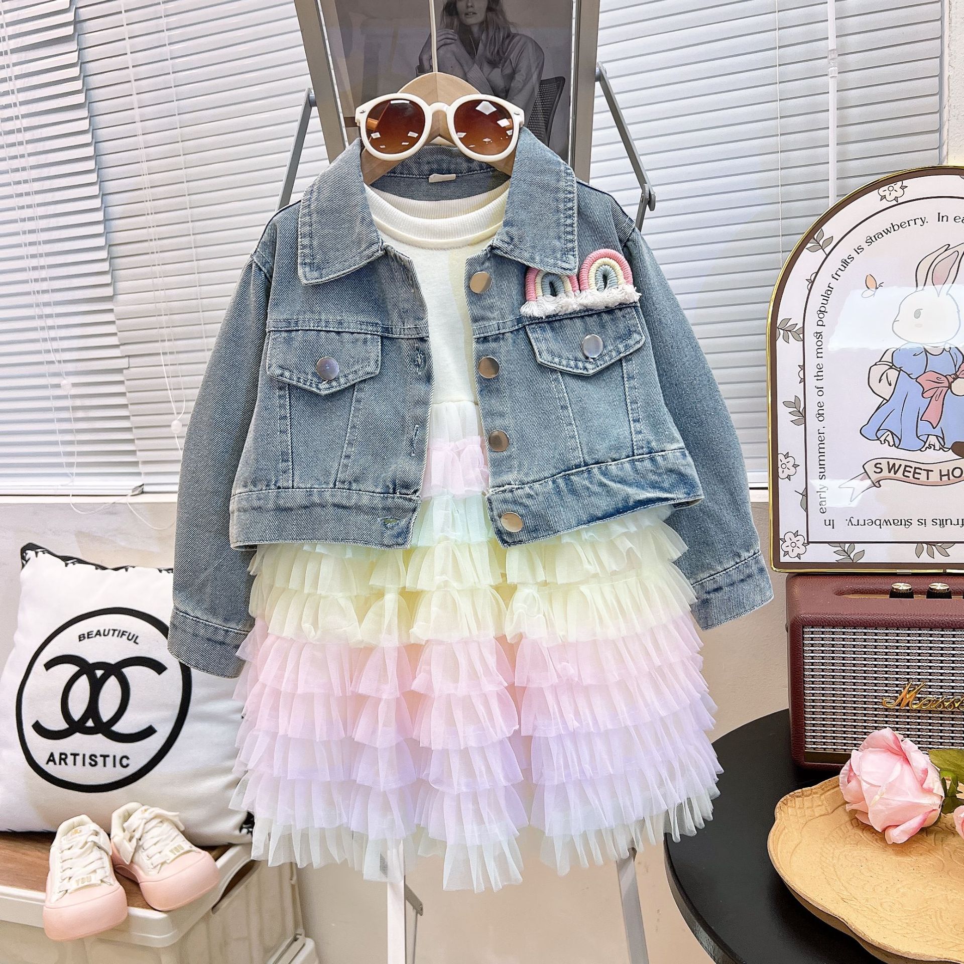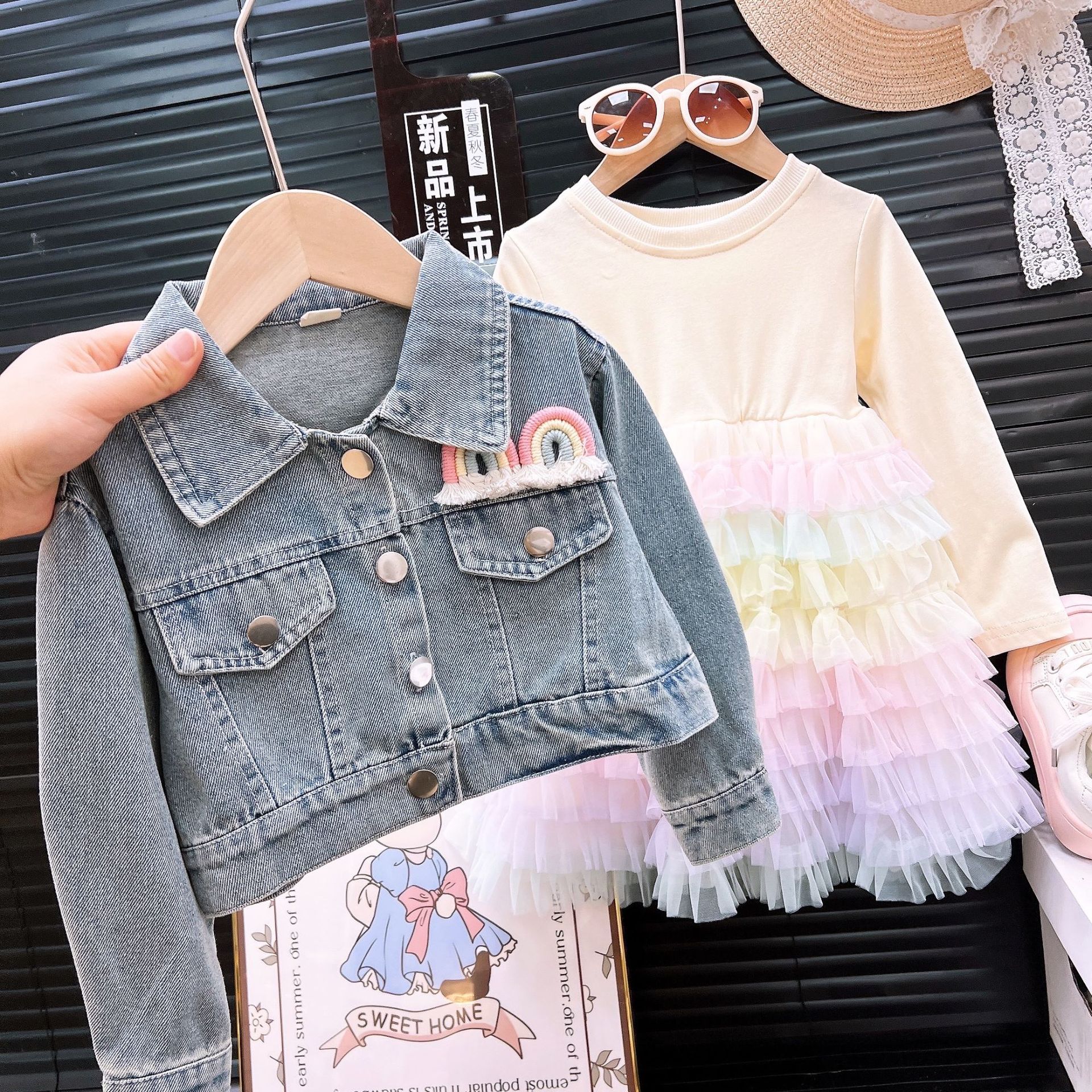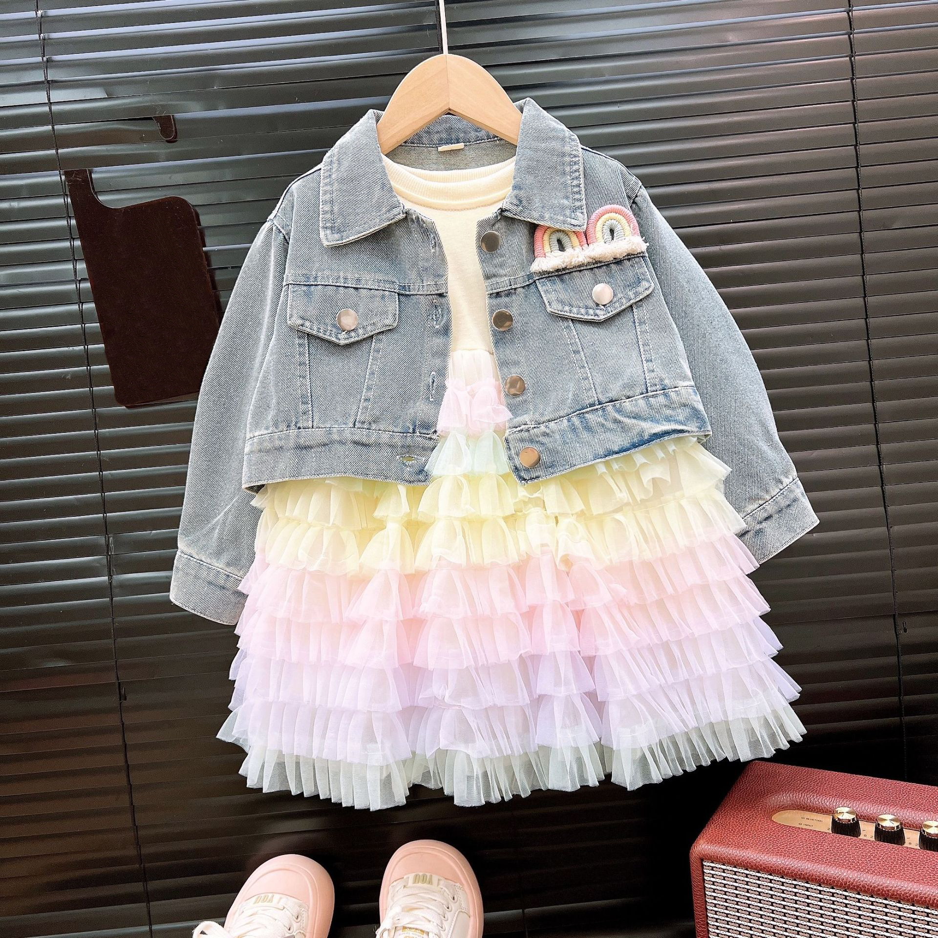 Set de 2 piese format din rochie cu tul multistrat colorat și jachetă din denim Beautifull Rainbow