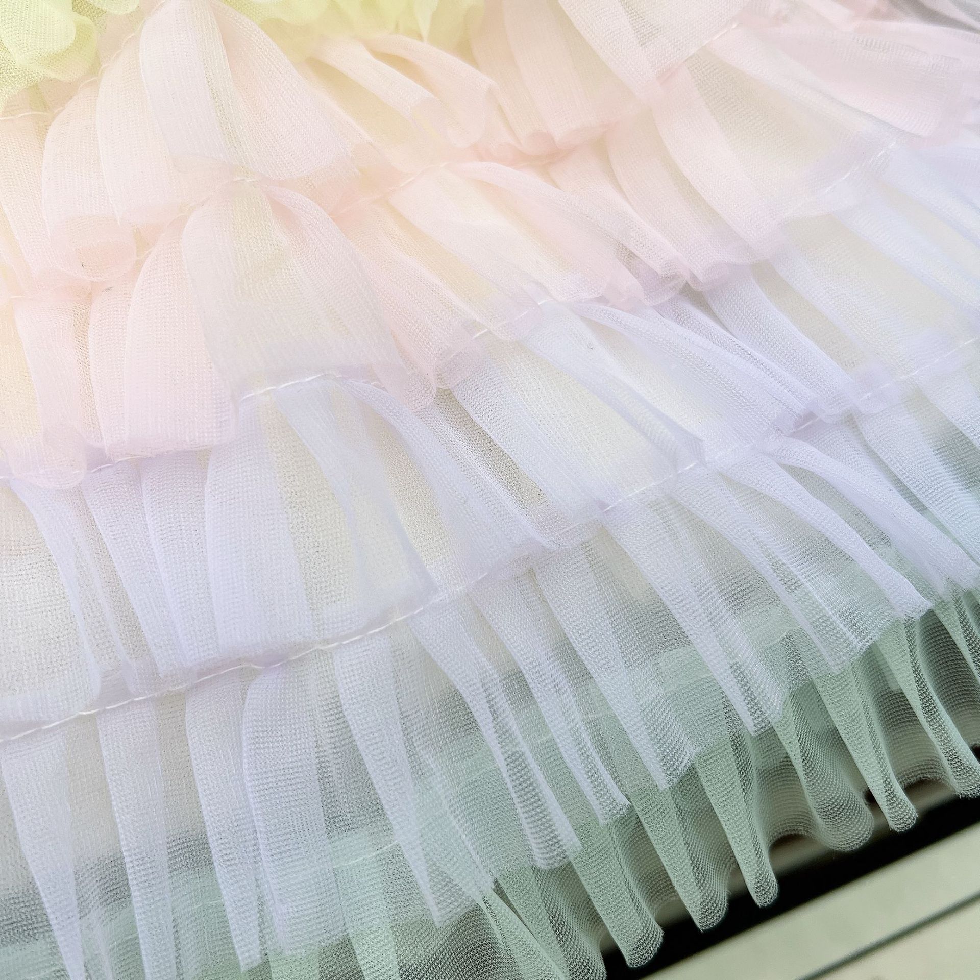 – Rochie cu fustă tutu multistrat, realizată din straturi fine de tulle cu efect de degrade delicat – alb, roz, galben și liliachiu pastel. Partea superioară este din tip lacoste, într-o nuanță deschisă și simplă, care echilibrează partea inferioară bogată. Fusta are o structură amplă ce creează o mișcare spectaculoasă și un aspect de poveste la fiecare pas.
