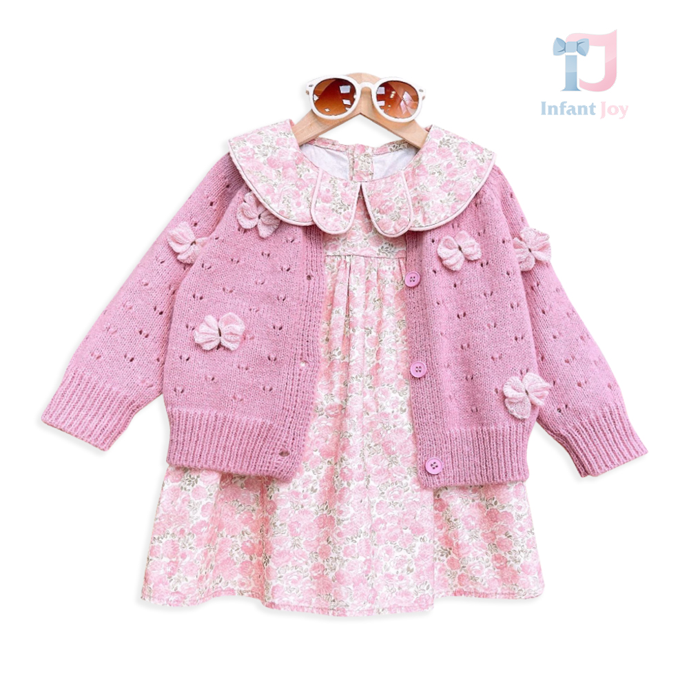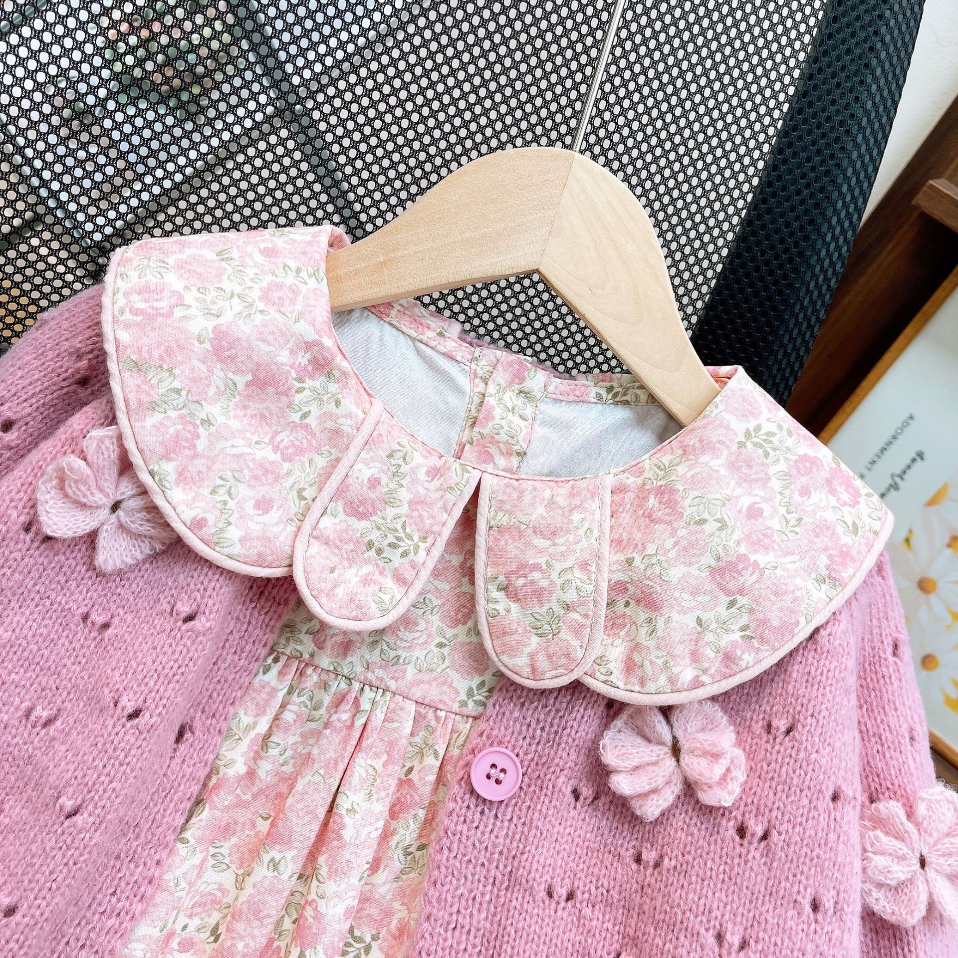 Set de 2 piese format din rochie florală cu guler modern și cardigan din tricot cu elemente 3D Rose Ribbons