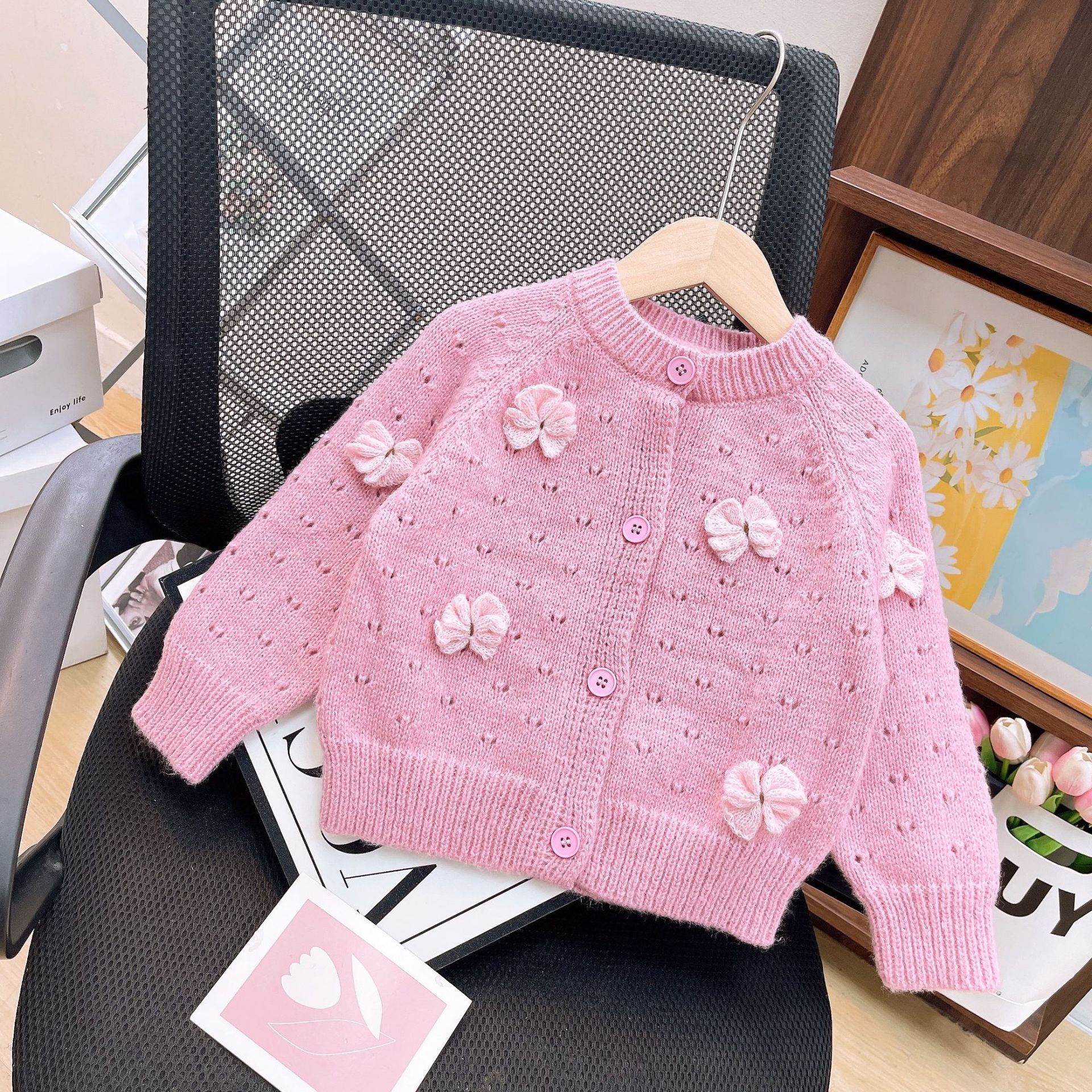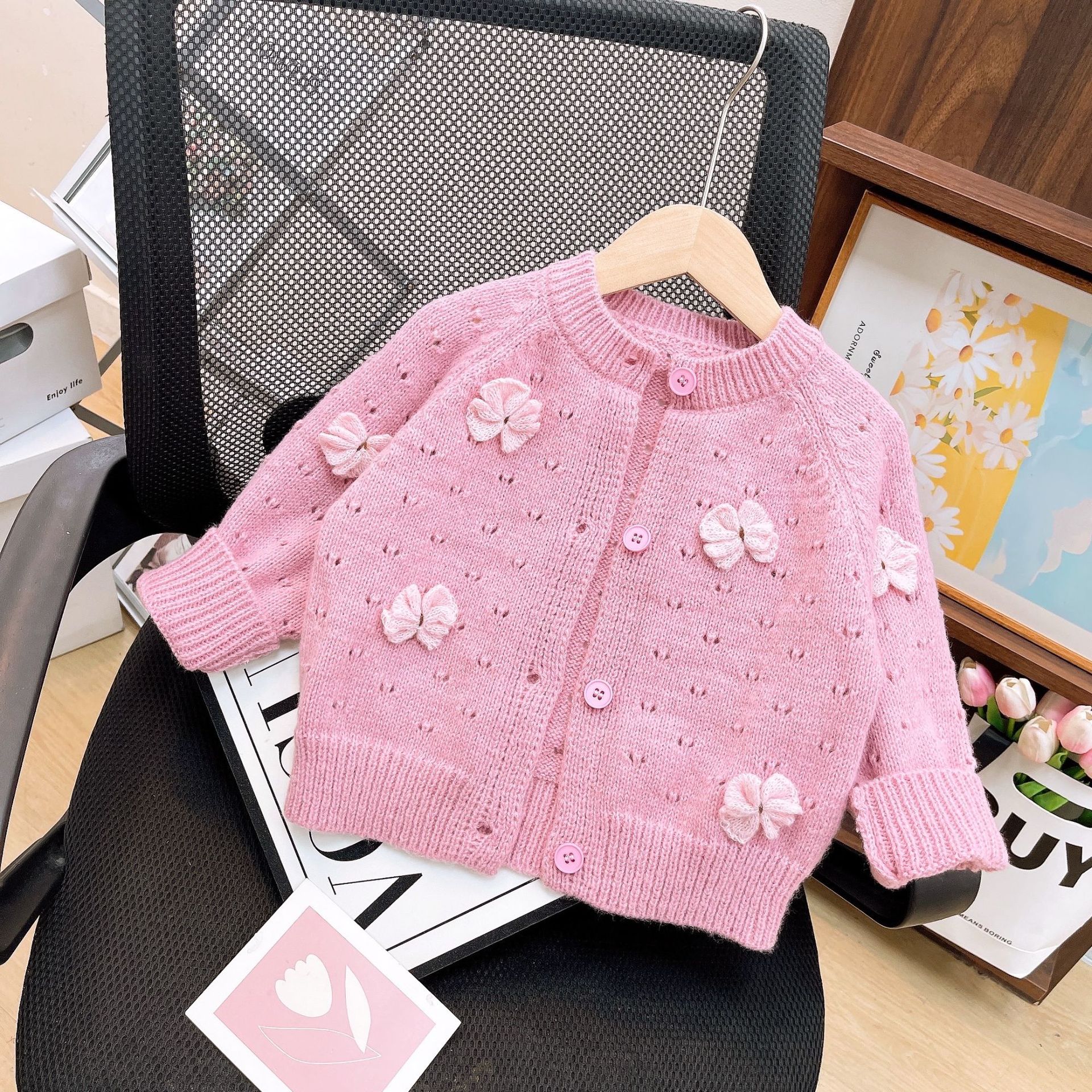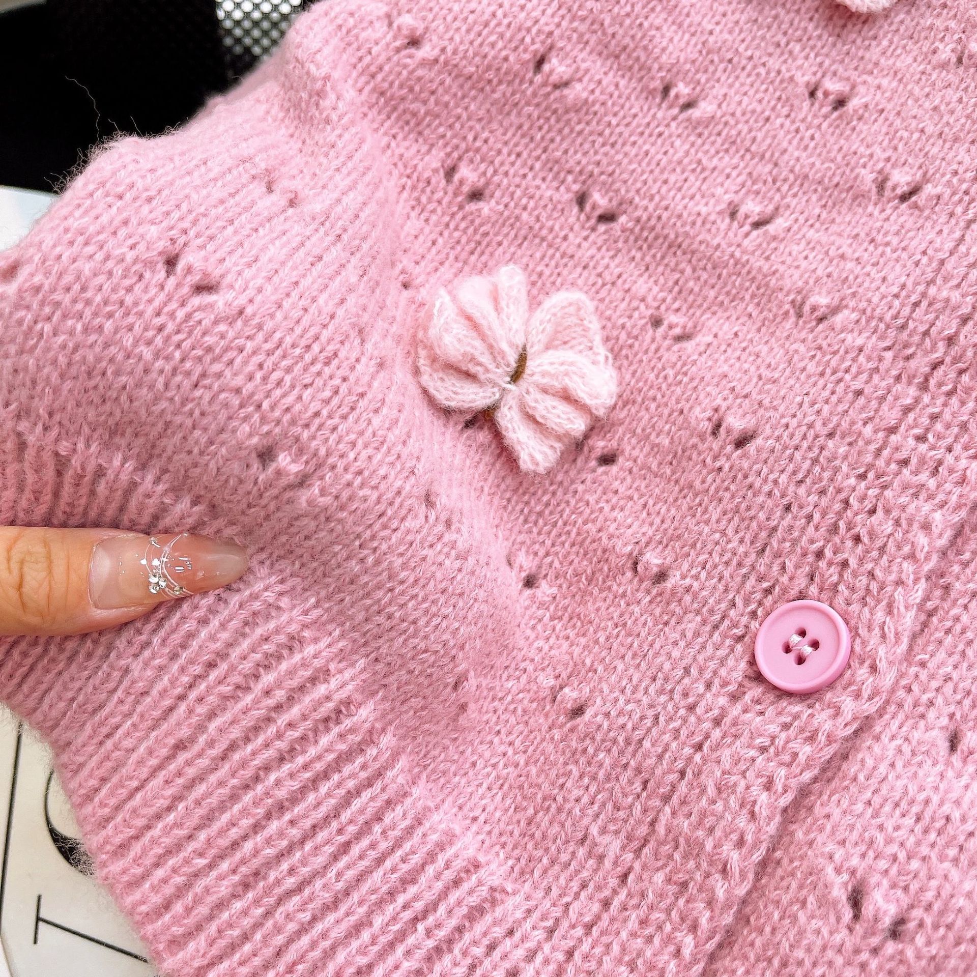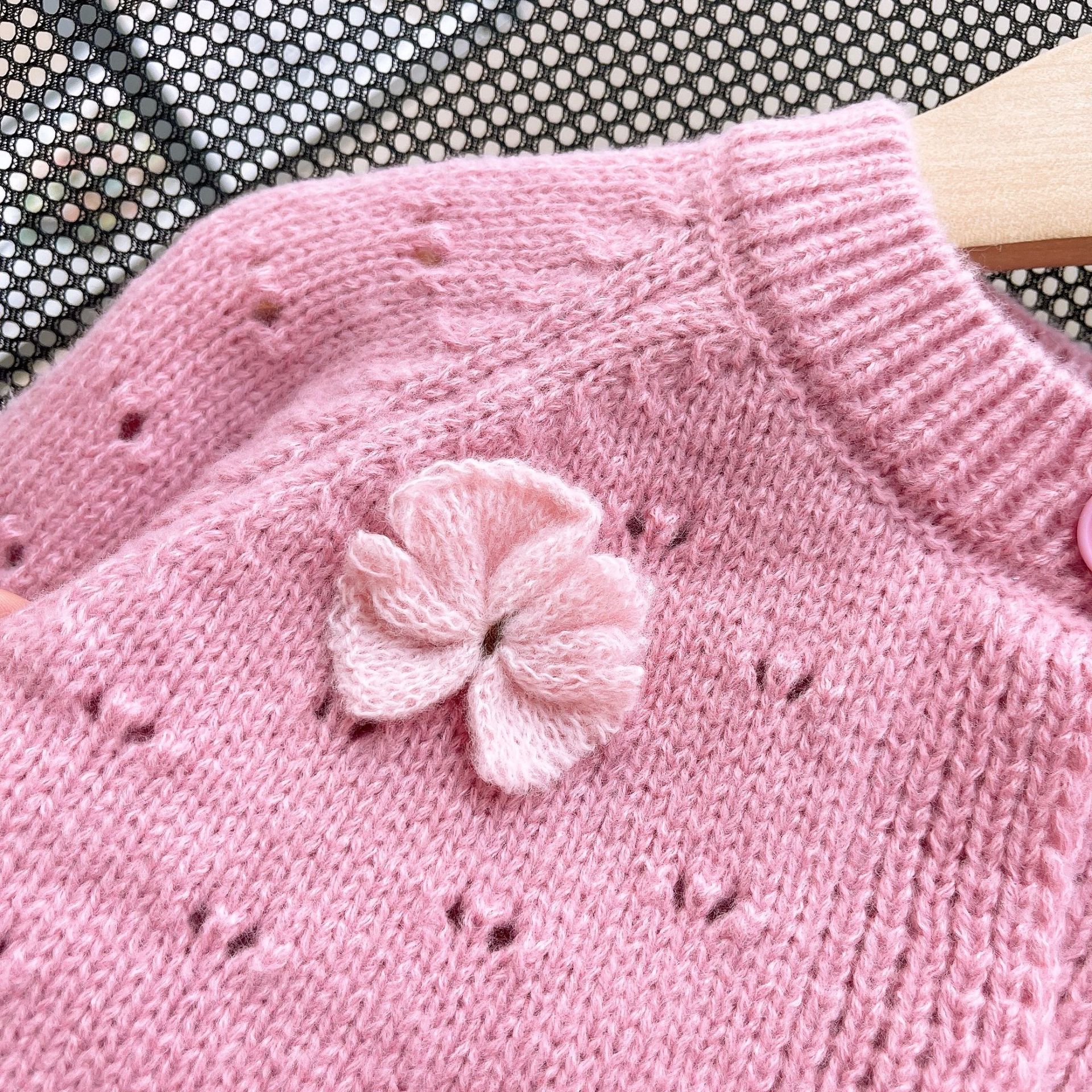 – Jachetă din tricot moale, într-o nuanță caldă de roz, decorată cu flori 3D delicate și detalii reliefate fine. Modelul are nasturi în față și o croială comodă, care asigură căldură și un stil complet.