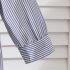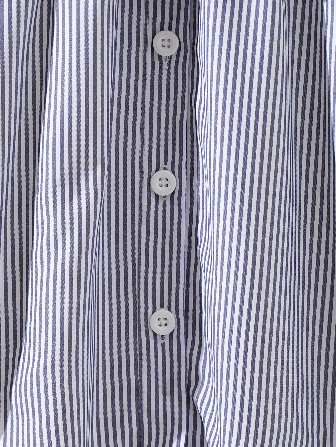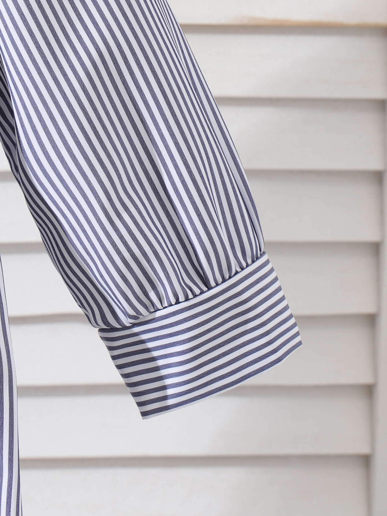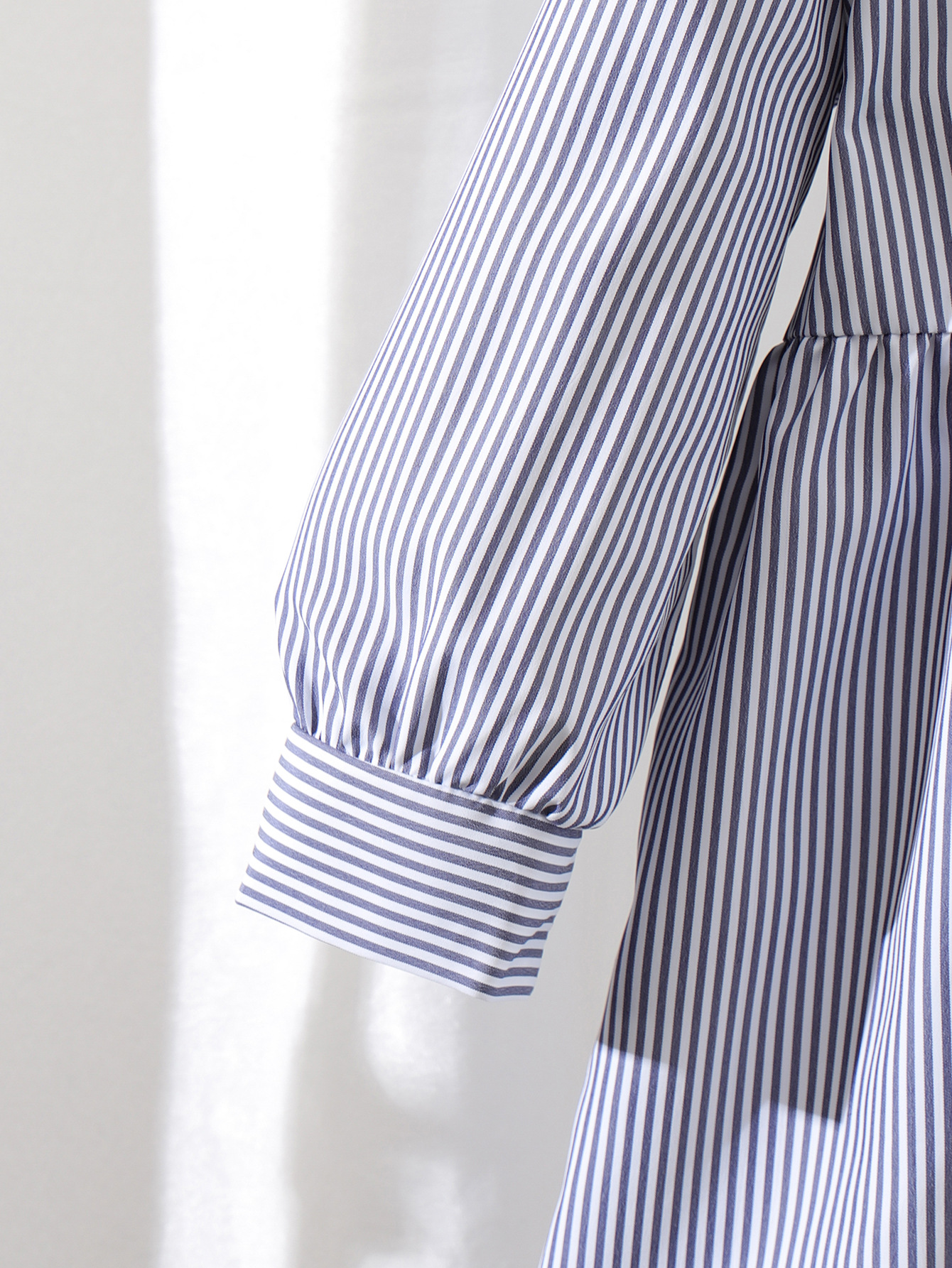 – Rochie tip cămașă într-o nuanță delicată de roz cu dungi fine, confecționată dintr-un material ușor și rezistent. Modelul are guler clasic și închidere cu nasturi pe toată lungimea. Partea superioară este ușor cambrată, iar cea inferioară – ușor evazată, creând o linie frumoasă și elegantă. Mânecile sunt lungi, prevăzute cu manșete, iar broderia delicată din zona superioară adaugă un accent rafinat.