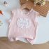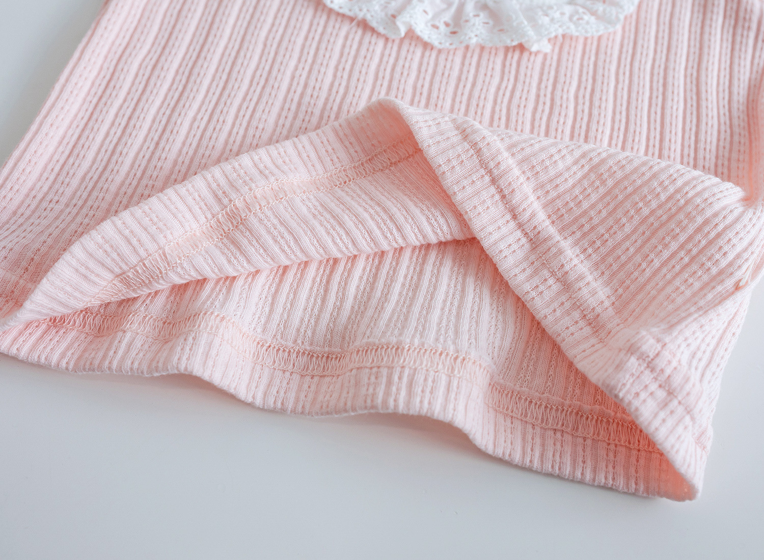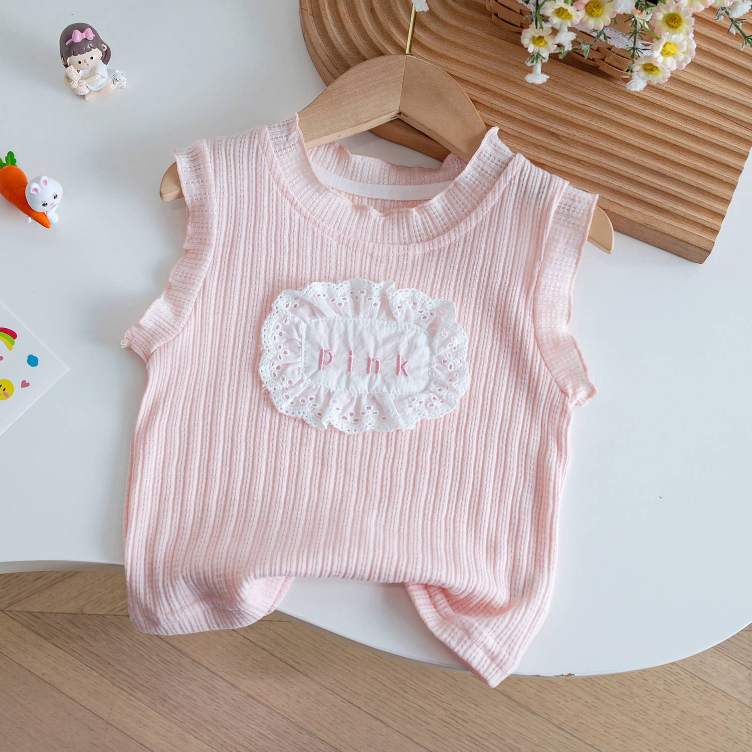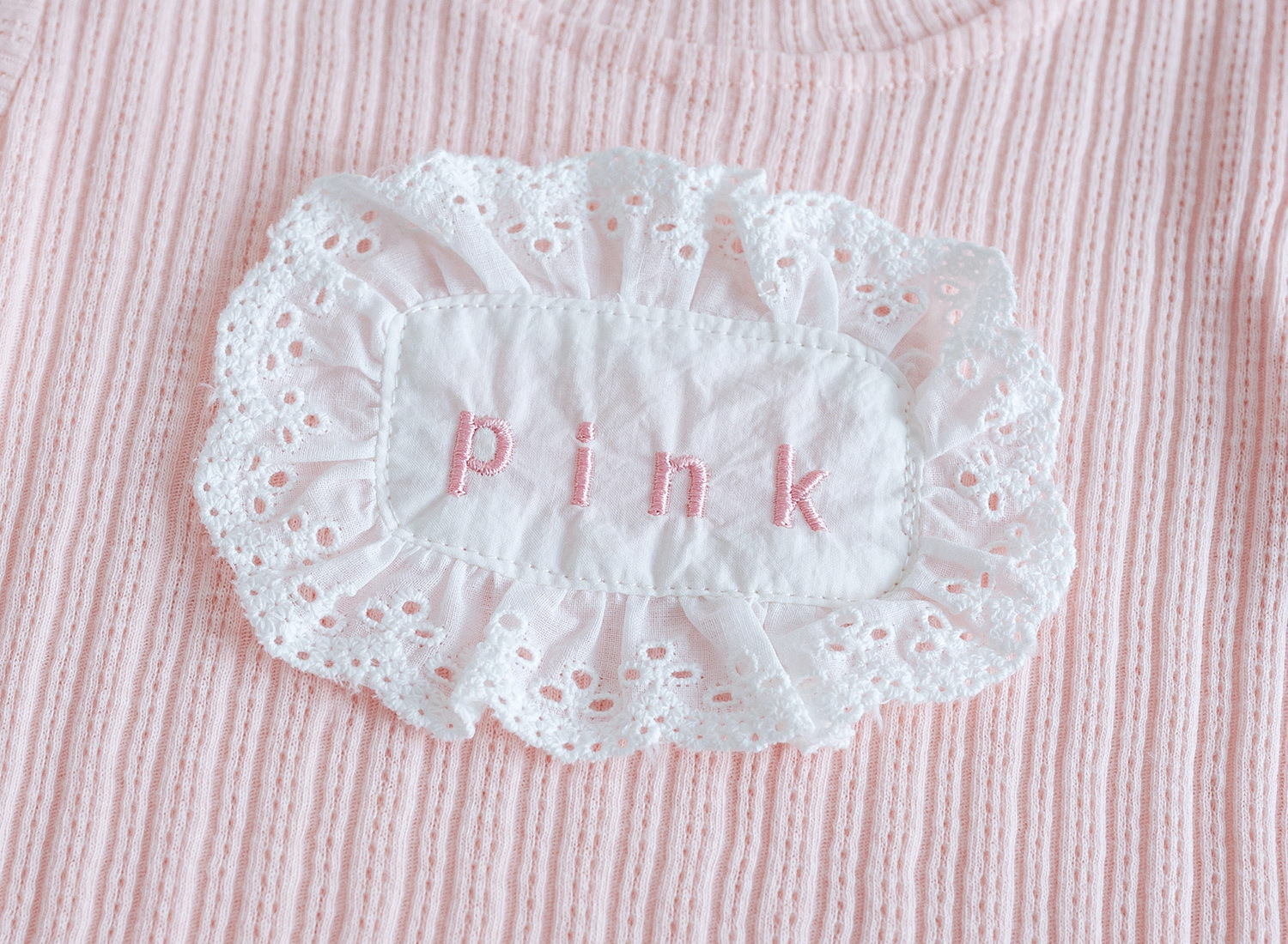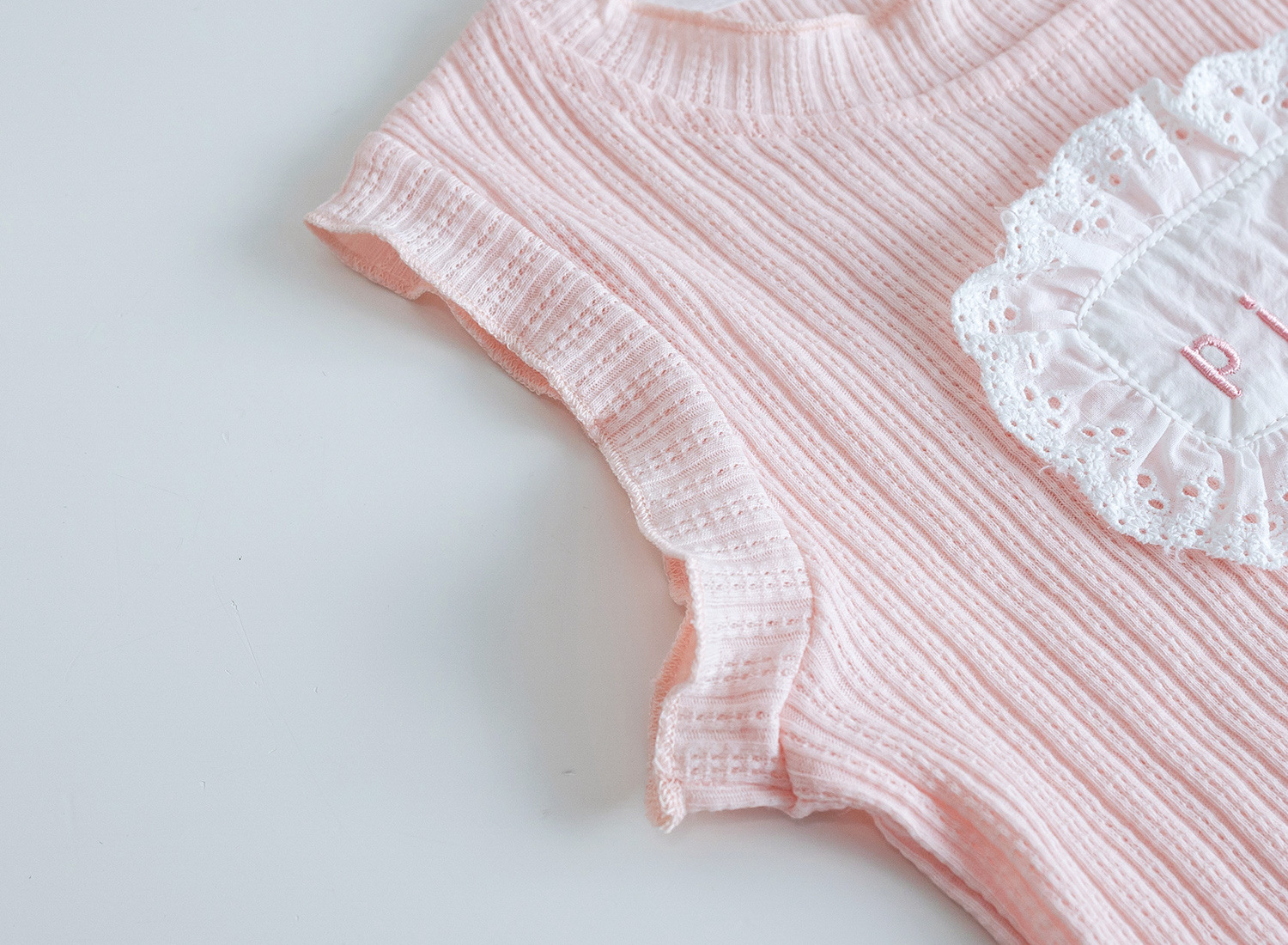 – Bluziță fără mâneci într-o nuanță fină de roz pudrat, confecționată dintr-un material moale, tip rib. Modelul are un decolteu rotund și o textură delicată, iar accentul îl reprezintă aplicația dantelată din față cu inscripție, care oferă o notă rafinată și elegantă.
