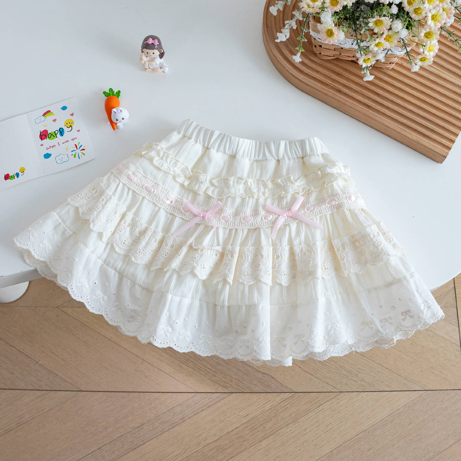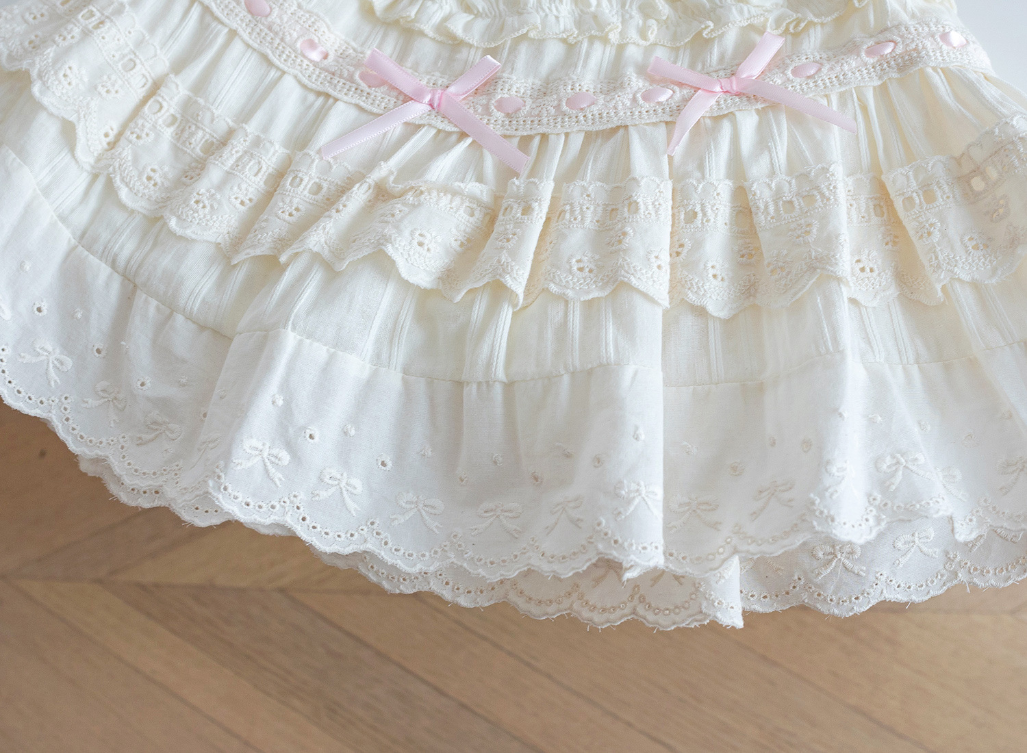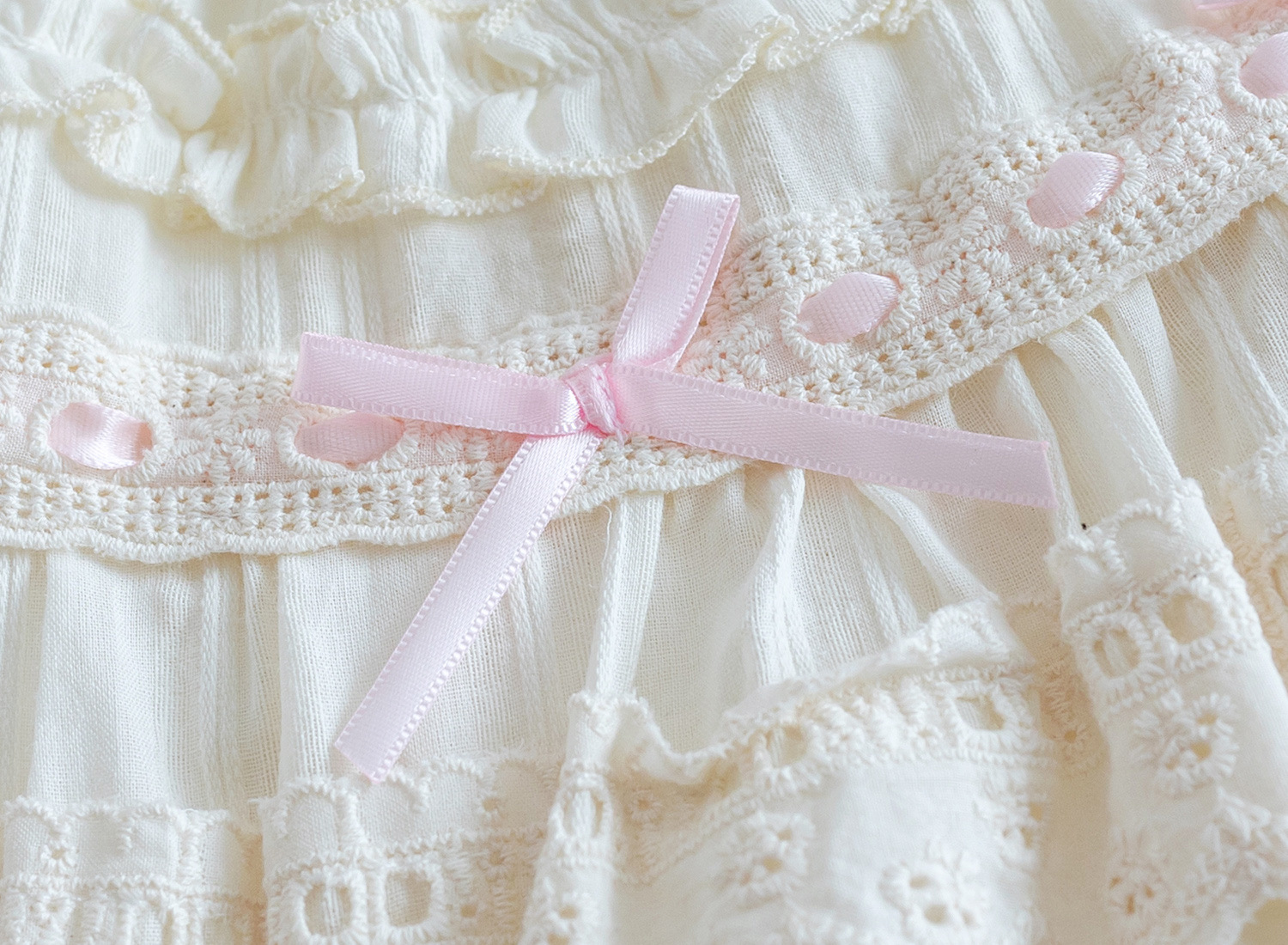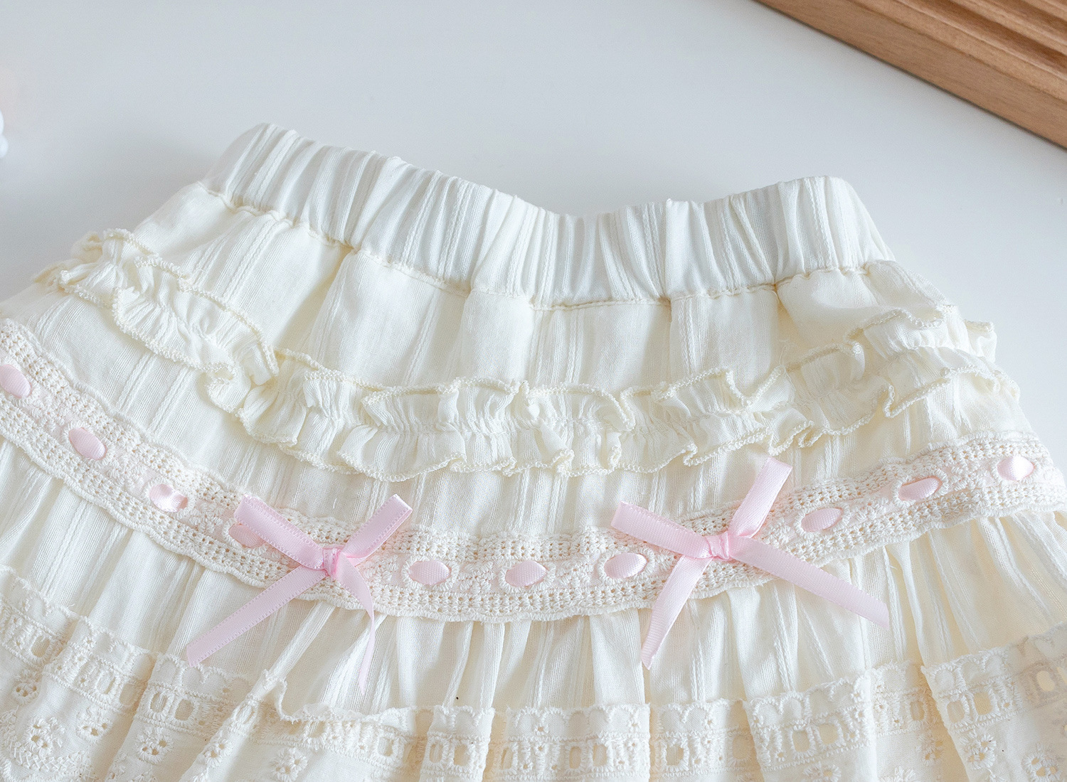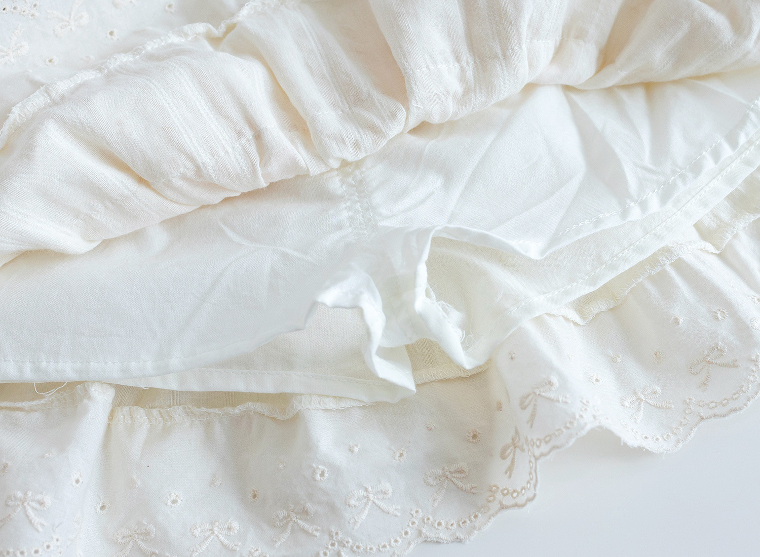 – Fustiță în culoare crem, cu croială în mai multe straturi, realizată dintr-un material vaporos cu detalii din dantelă. Este decorată cu fundițe fine și elemente din dantelă, care creează un aspect extrem de romantic și luxos. Are o căptușeală interioară din bumbac, tip chiloți, pentru confort în timpul purtării.