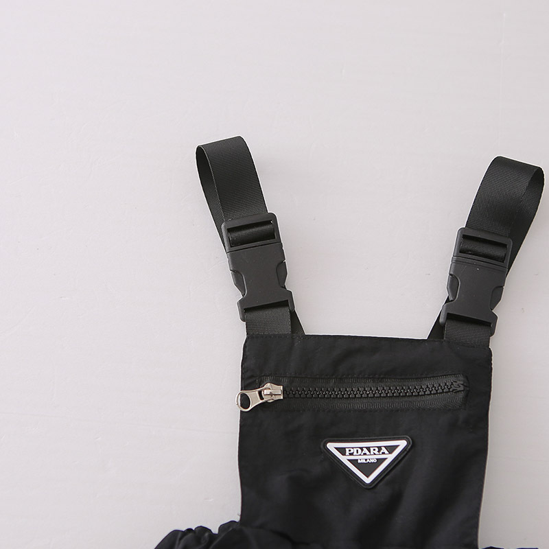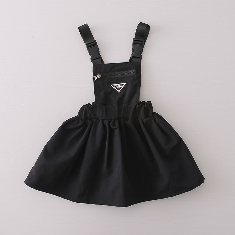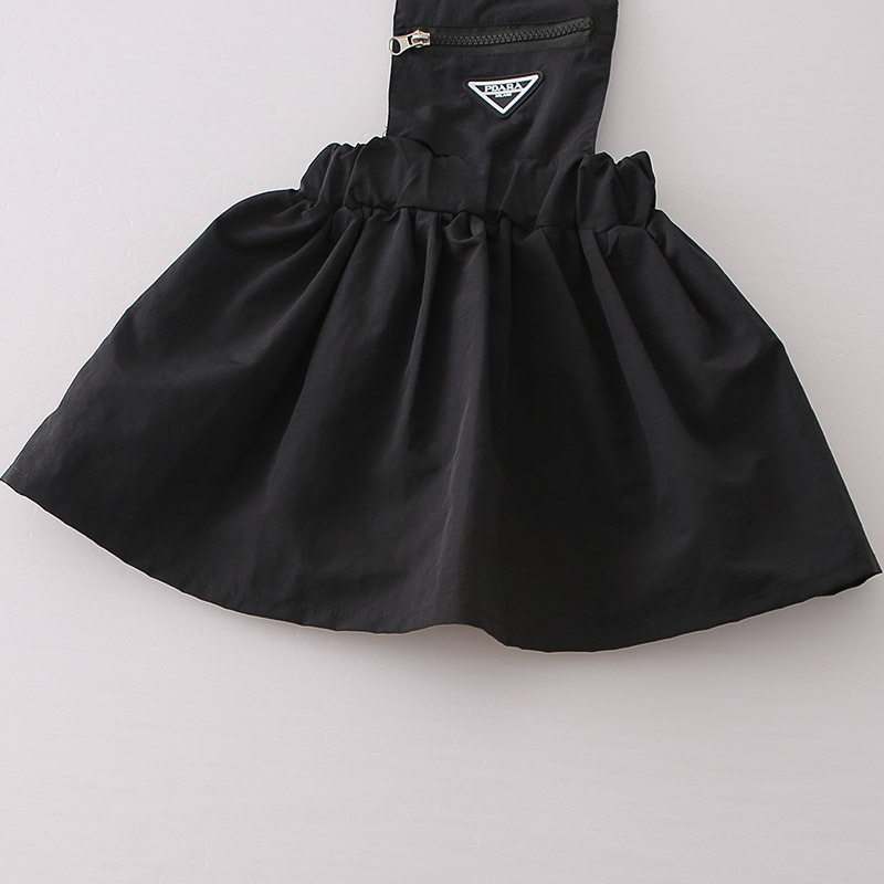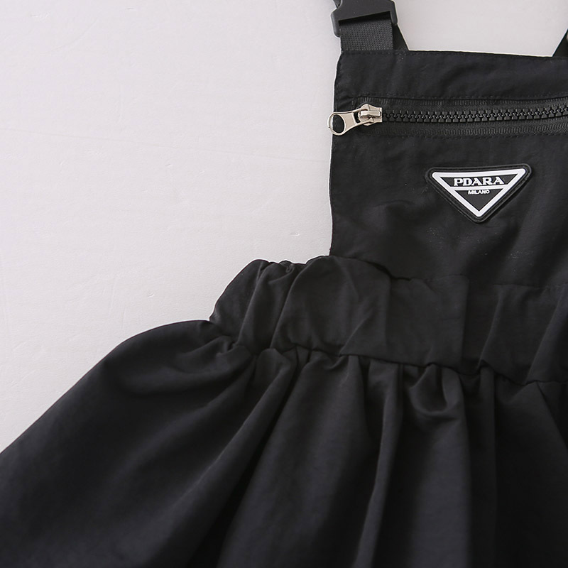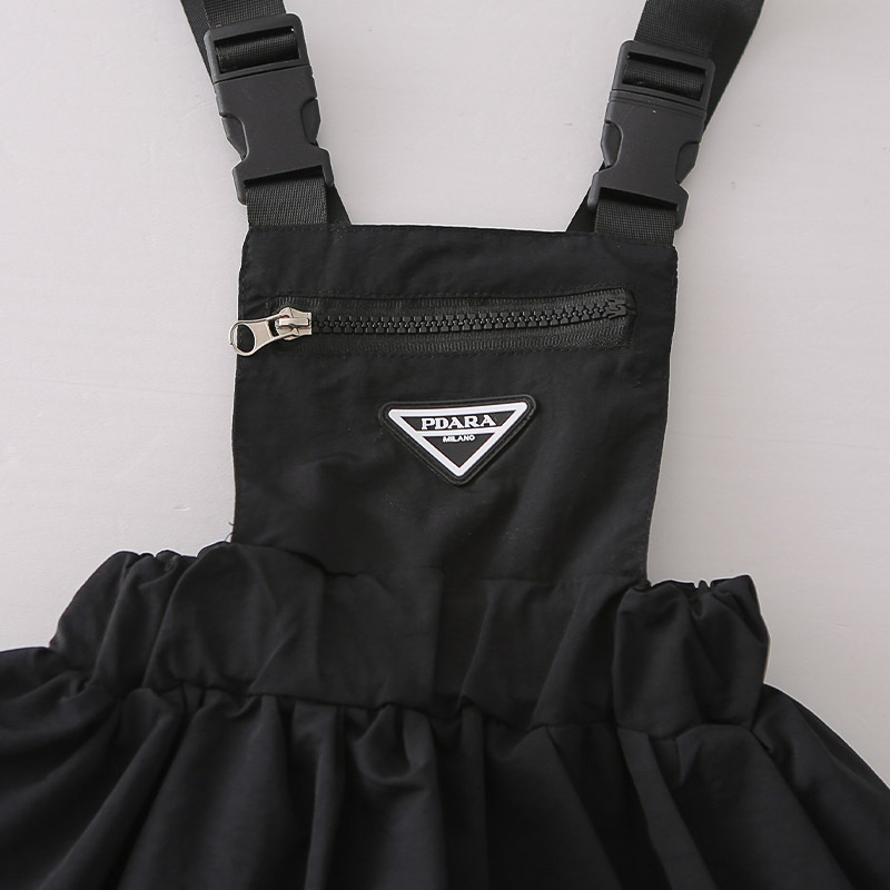 – Rochie tip sarafan, în culoare neagră clasică, realizată din material dens și de calitate. Modelul are bretele reglabile cu catarame, talie elastică și partea de jos amplă și evazată, care oferă volum și o mișcare frumoasă. Accentele moderne – fermoarul și micul logo din față – completează ținuta cu o notă ușoară de stil „street”.