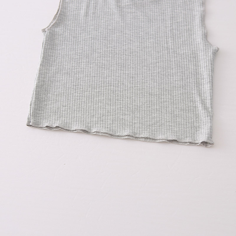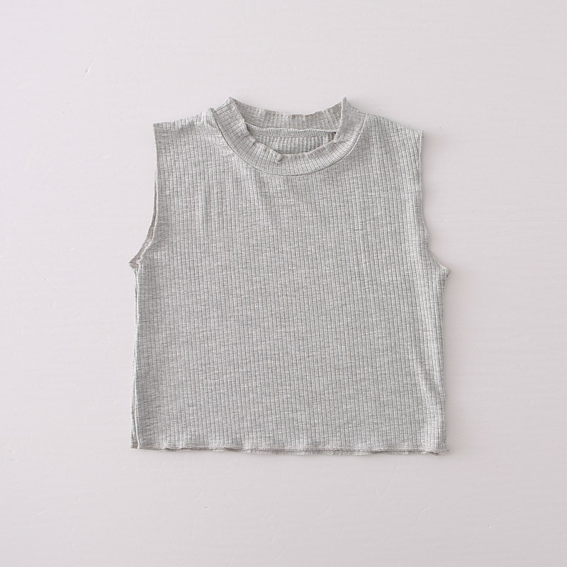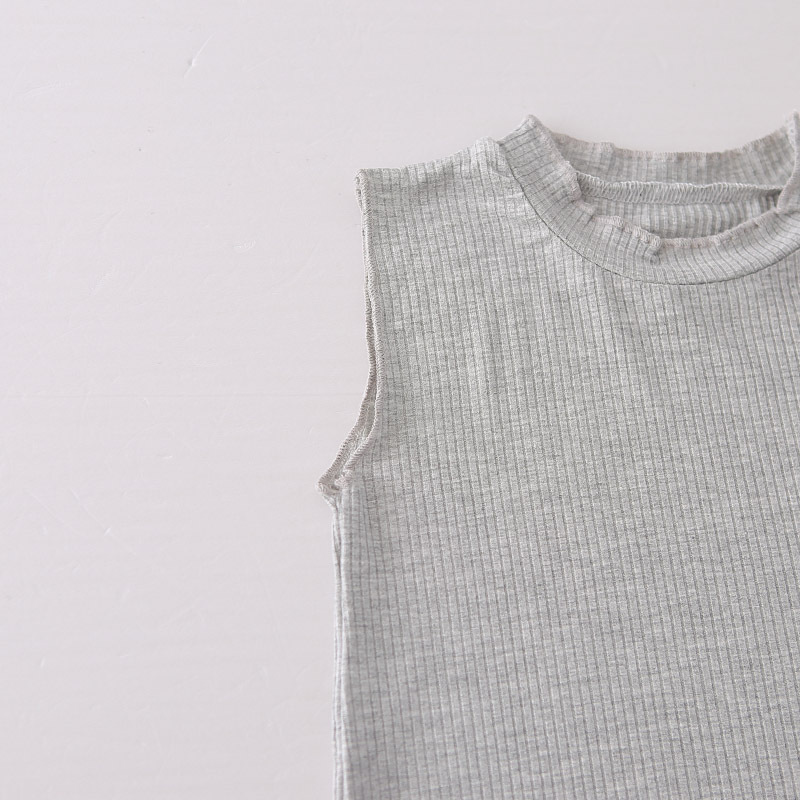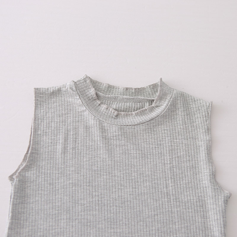 – Bluză fără mâneci, în nuanță gri deschis, confecționată din material fin tip rib, moale și plăcut la atingere. Modelul are guler înalt și un design simplu, care creează o bază stilată pentru întreaga ținută.