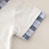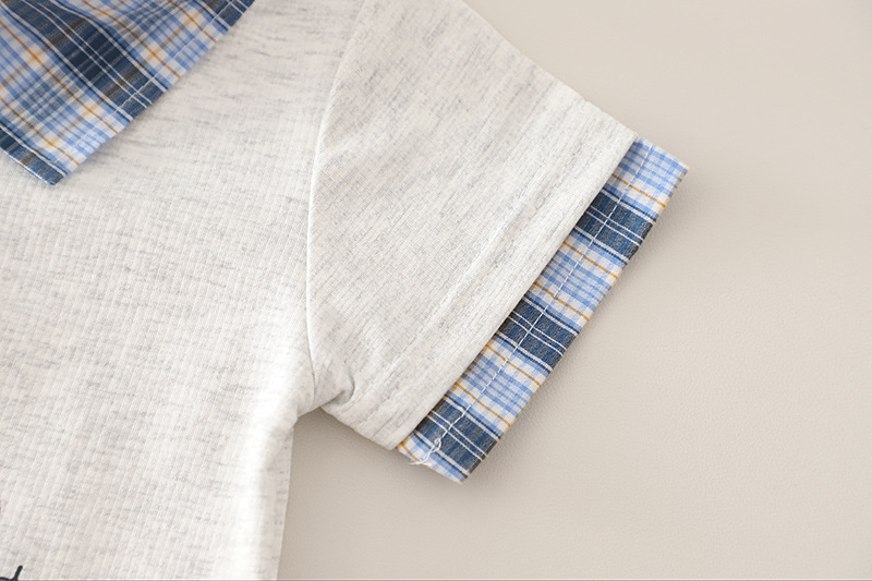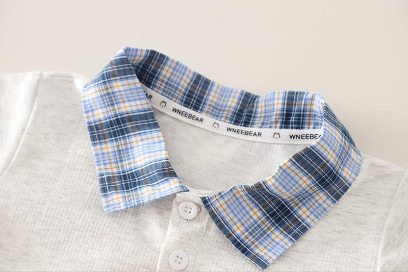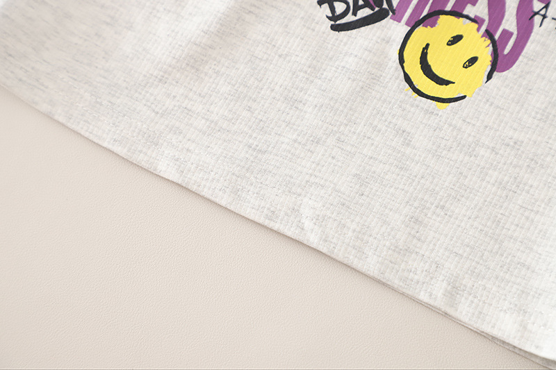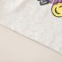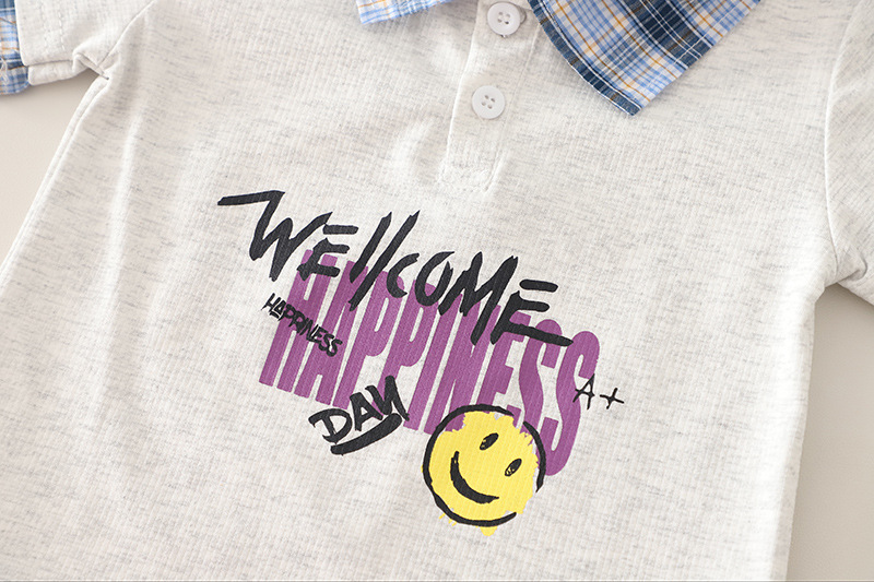 – Tricou cu mânecă scurtă, într-o nuanță gri deschis, confecționat din material moale și respirabil. Modelul are nasturi, decolteu rotund și guler cu imprimeu în carouri albastre, care se regăsește și pe marginile mânecilor – un accent stilat cu caracter modern. În față are o imprimare cu inscripție și un chip zâmbitor, ce oferă un aspect vesel și urban.