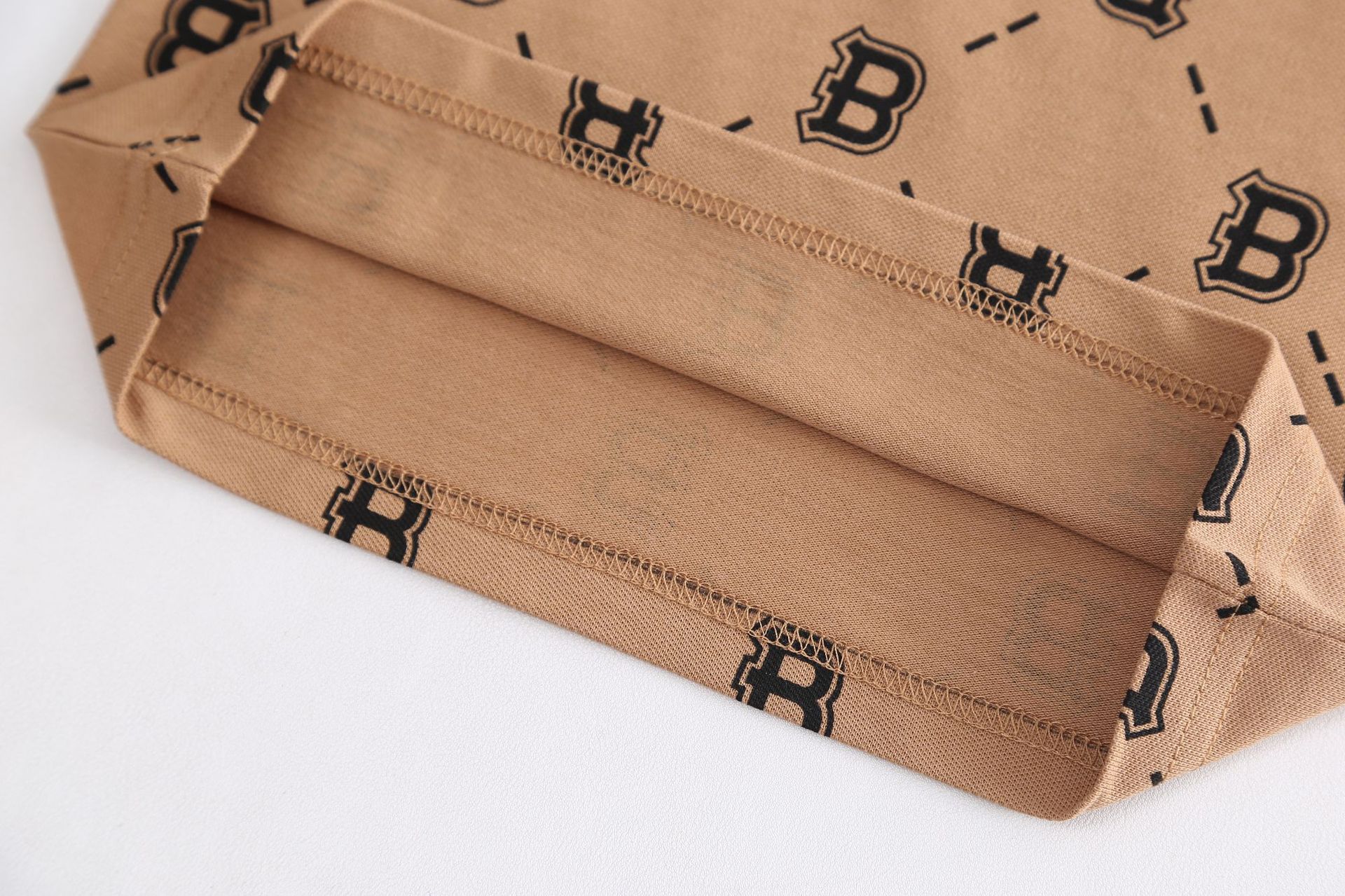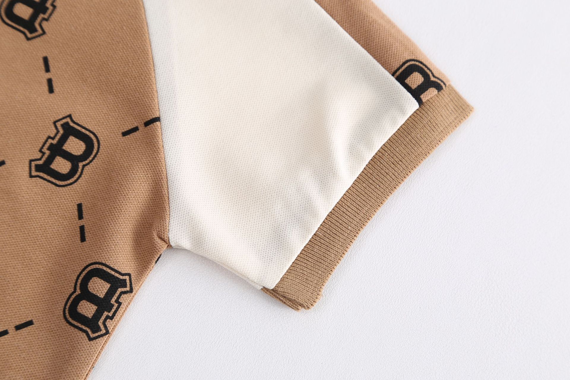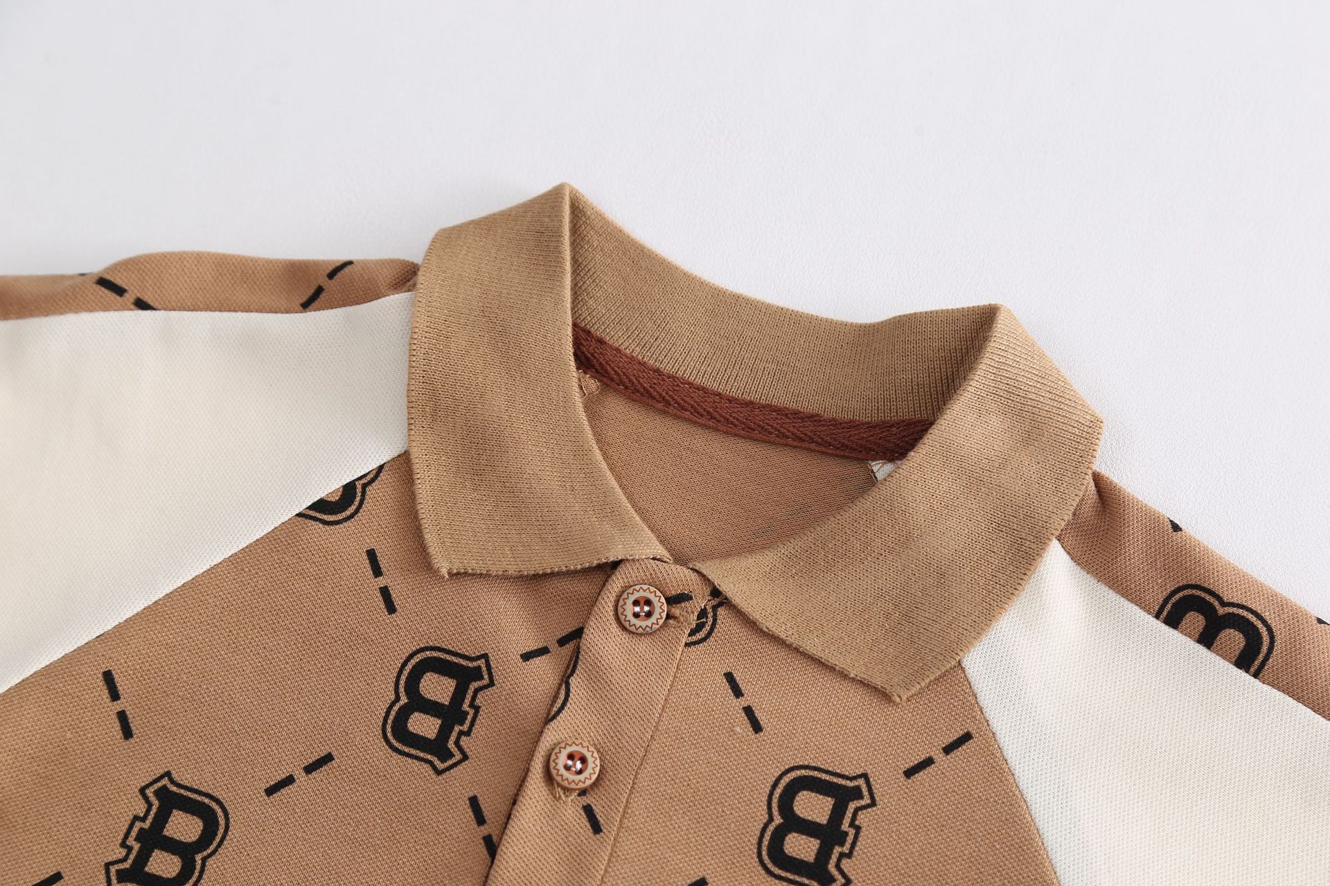 – Tricou într-o nuanță caldă de bej-maro, confecționat dintr-un material moale și respirabil tip pique. Modelul are guler clasic și nasturi în față, iar designul este completat de un imprimeu repetitiv cu literele „B”, care oferă un caracter modern și distinctiv. Mânecele prezintă panouri contrastante în culoare deschisă pentru un aspect mai modern.