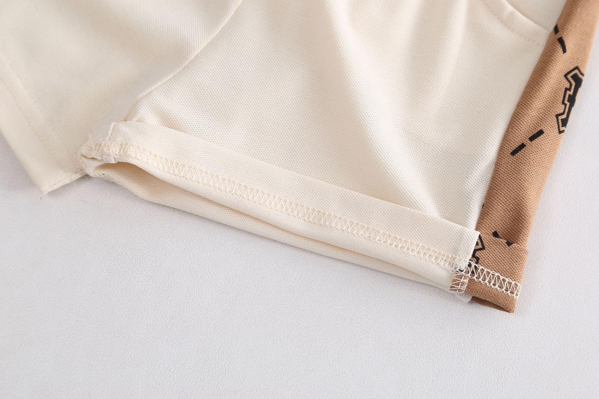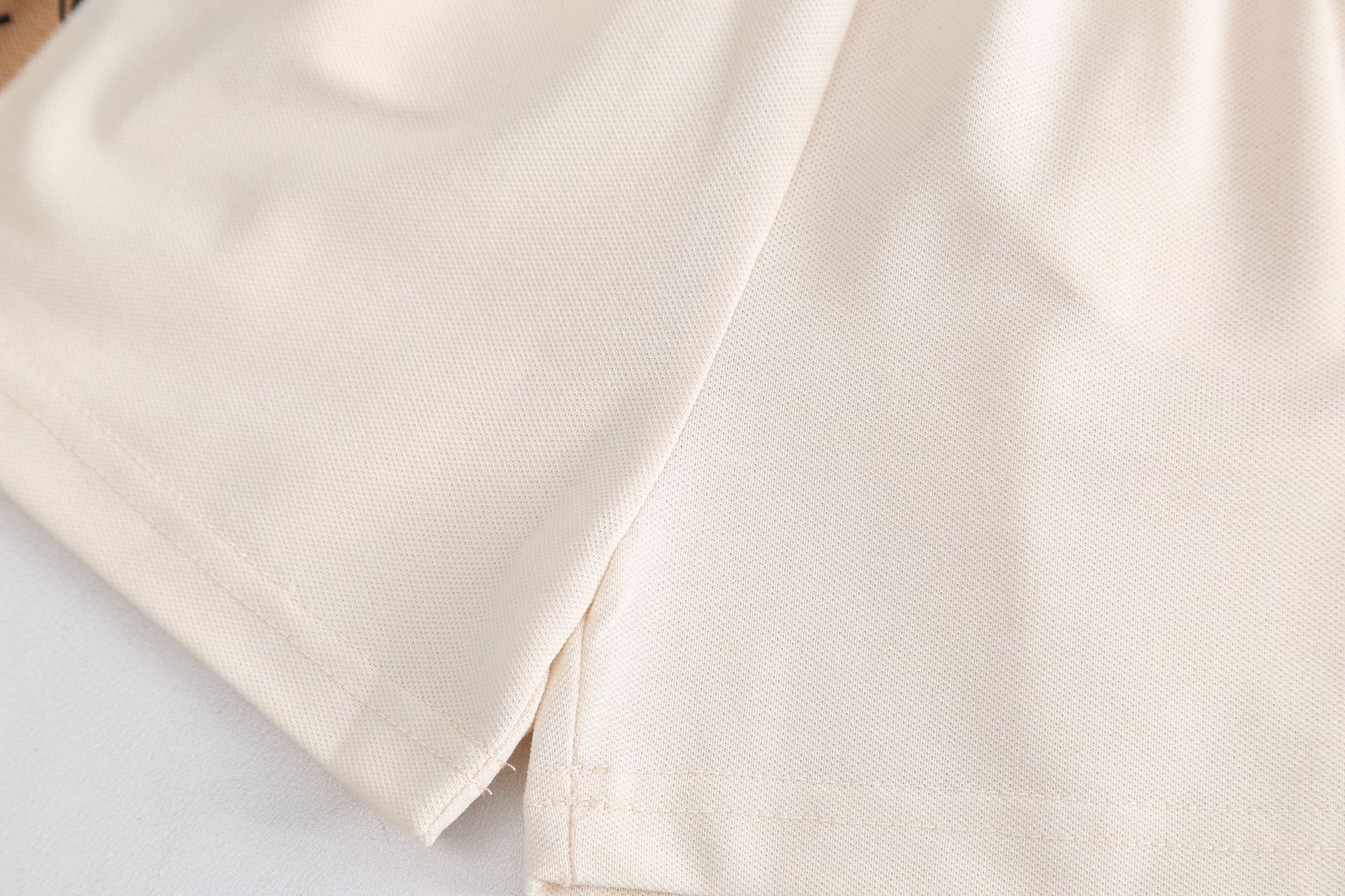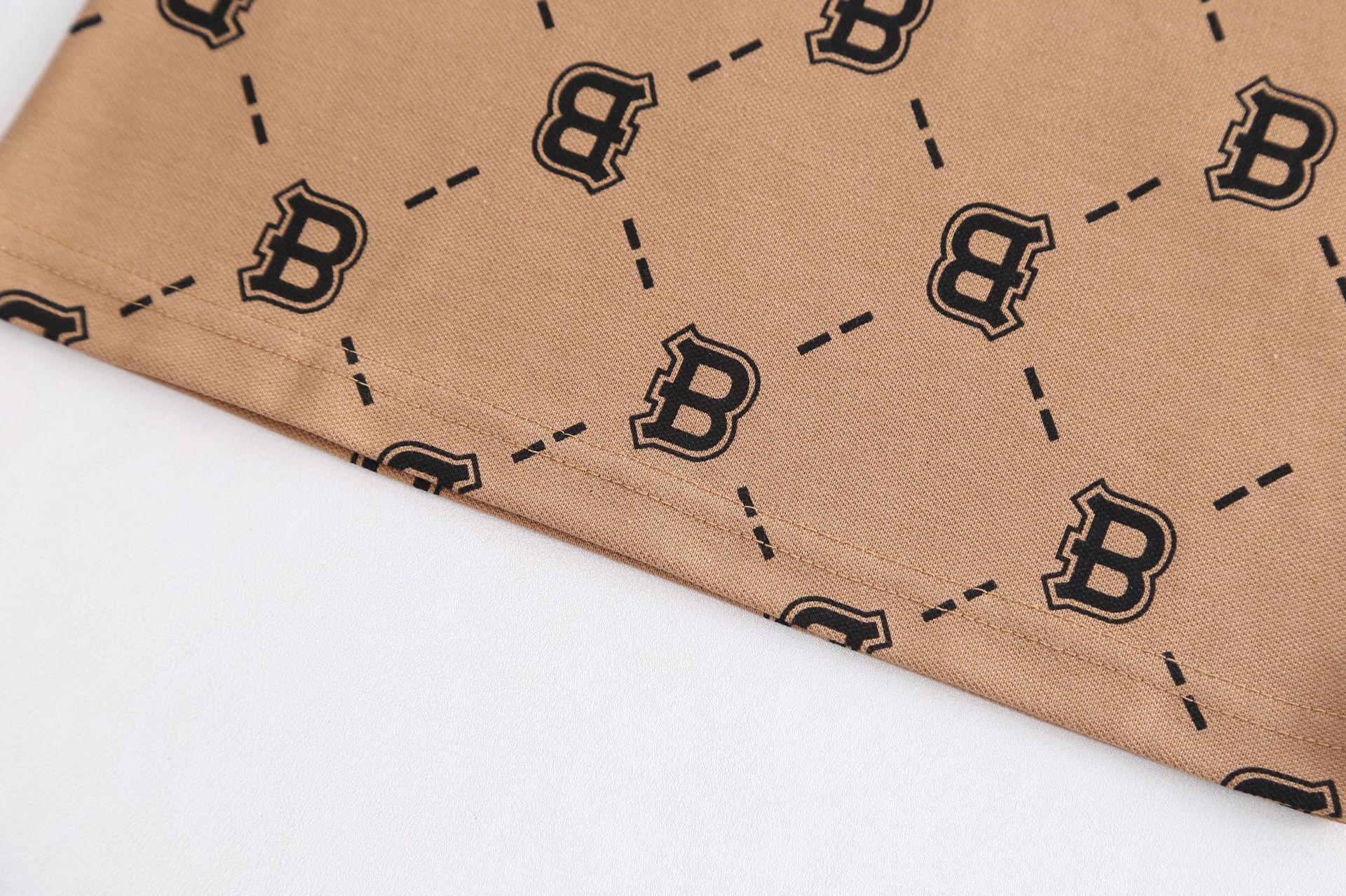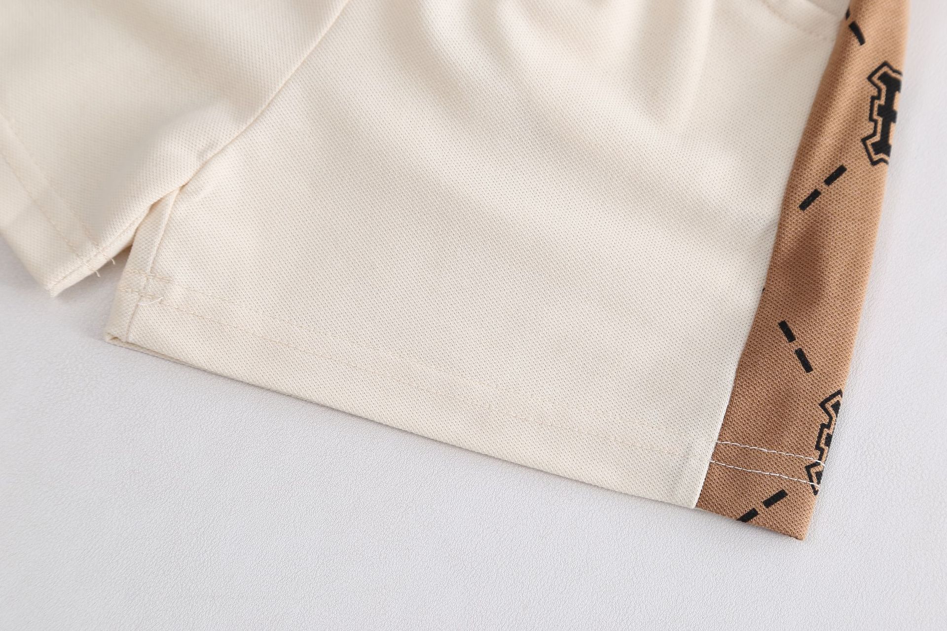 – Tricou într-o nuanță caldă de bej-maro, confecționat dintr-un material moale și respirabil tip pique. Modelul are guler clasic și nasturi în față, iar designul este completat de un imprimeu repetitiv cu literele „B”, care oferă un caracter modern și distinctiv. Mânecele prezintă panouri contrastante în culoare deschisă pentru un aspect mai modern.