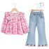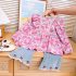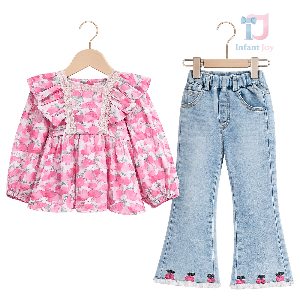Set de 2 piese format din tunică florală cu volane, dantelă și pantaloni din denim cu broderie Sweet Cherry