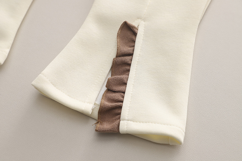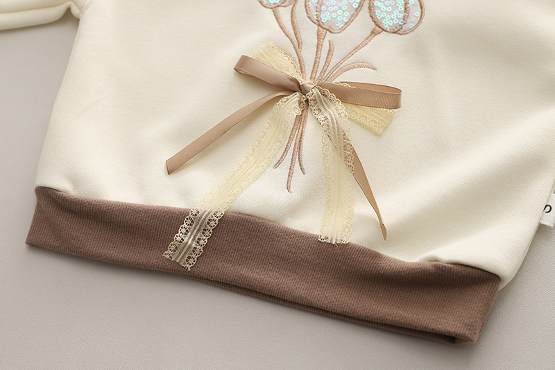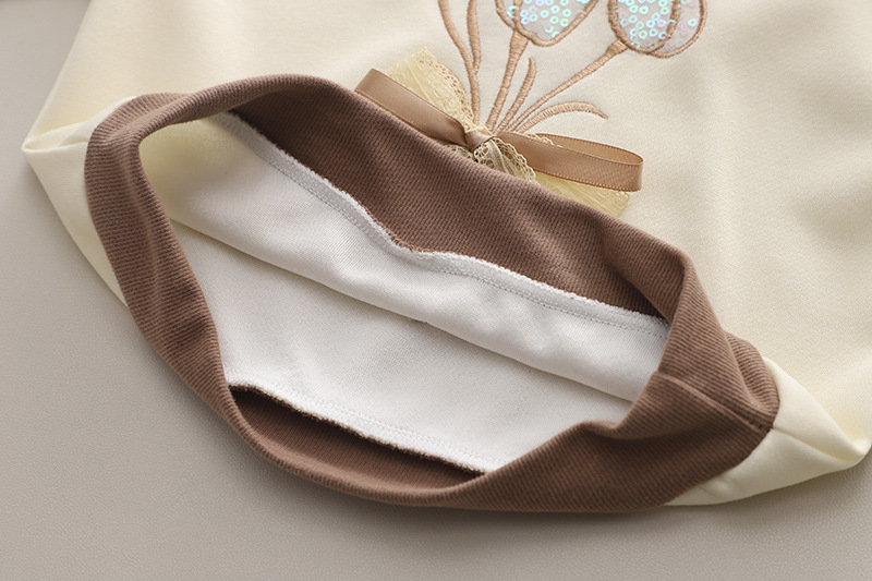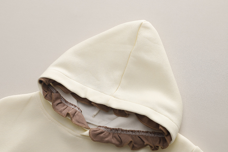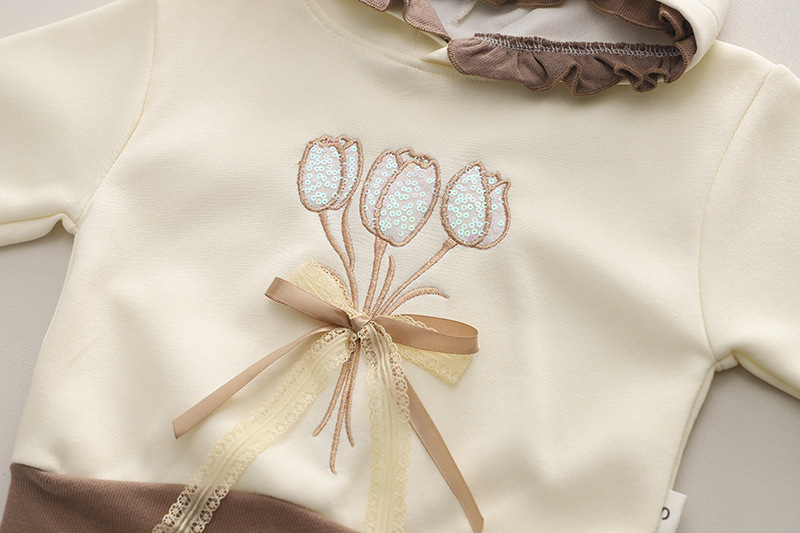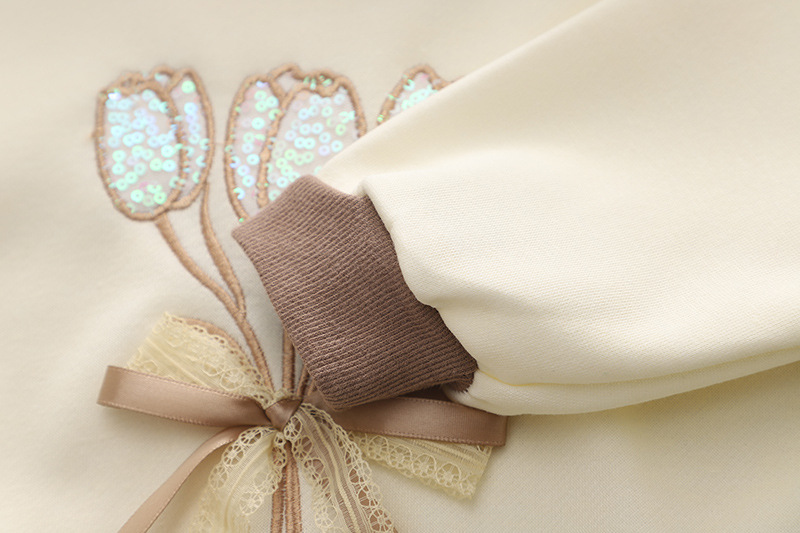 -Hanorac din material de înaltă calitate, de culoare crem. Model cu manșete elastice evidențiate la mâneci și talie, broderie florală decorată cu paiete în partea din față + fundă 3D. Glugă cu accente din organza pe margini pentru un stil unic.