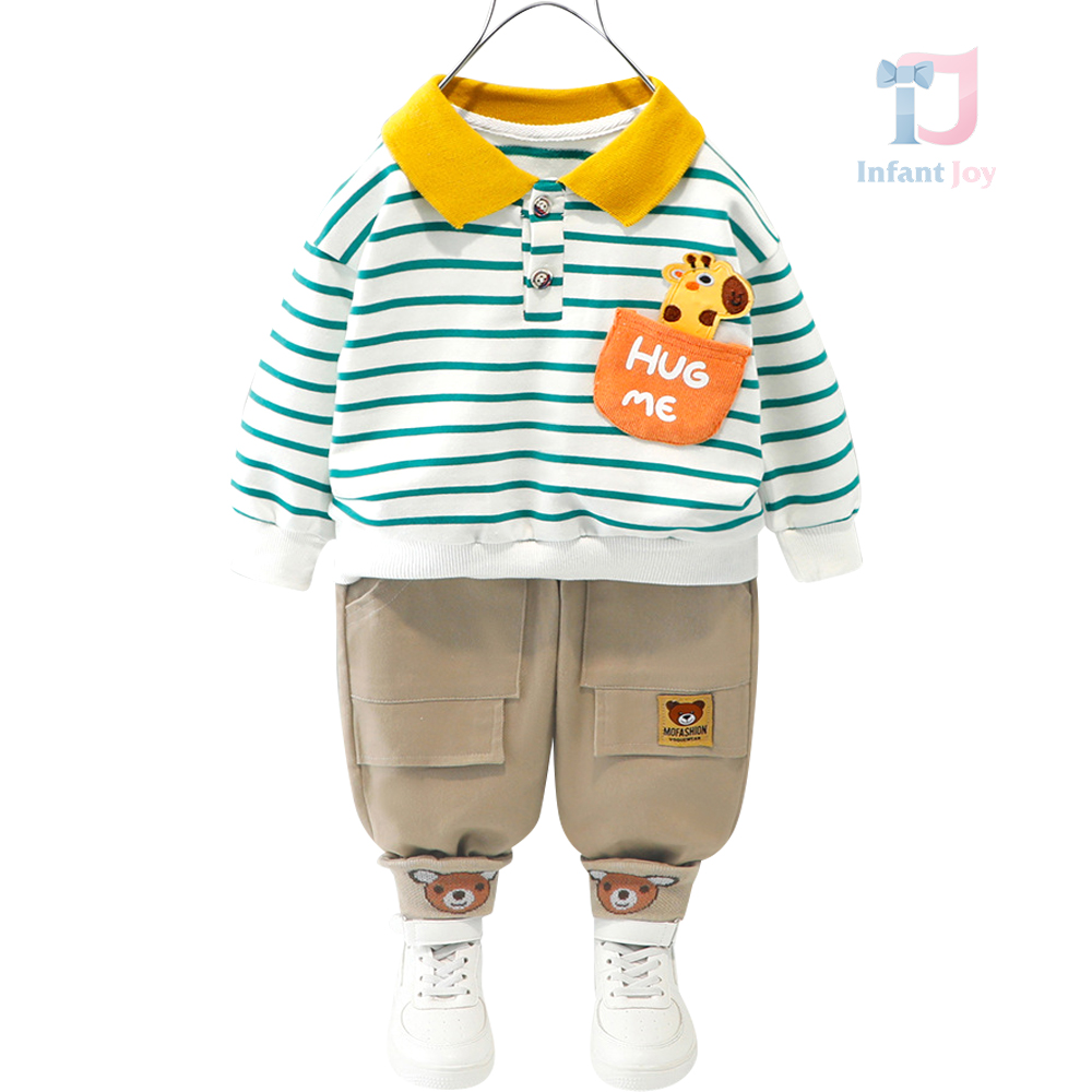 -Bluziță din material moale, alb cu dungi orizontale verzi. Model cu guler evidențiat, nasturi, buzunar aplicat în față și aplicație cu girafă.