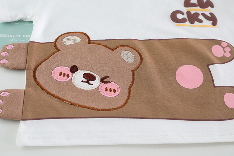 – Tricou cu mânecă scurtă, din bumbac de înaltă calitate, de culoare albă. Model cu croială standard, decorat cu imprimeu, broderie parțială și un element 3D – lăbuțe de ursuleț.