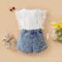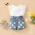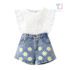-Pantaloni scurți din denim, cu talie înaltă elastică + nasture metalic, două buzunare frontale și unul la spate. Broderie atractivă cu margarete în partea din față pentru un stil modern.