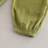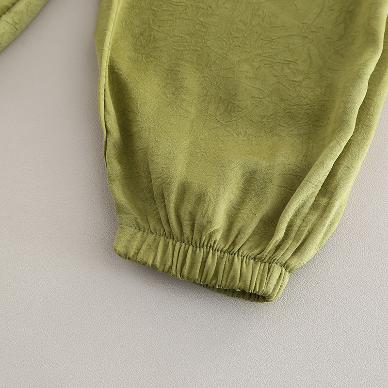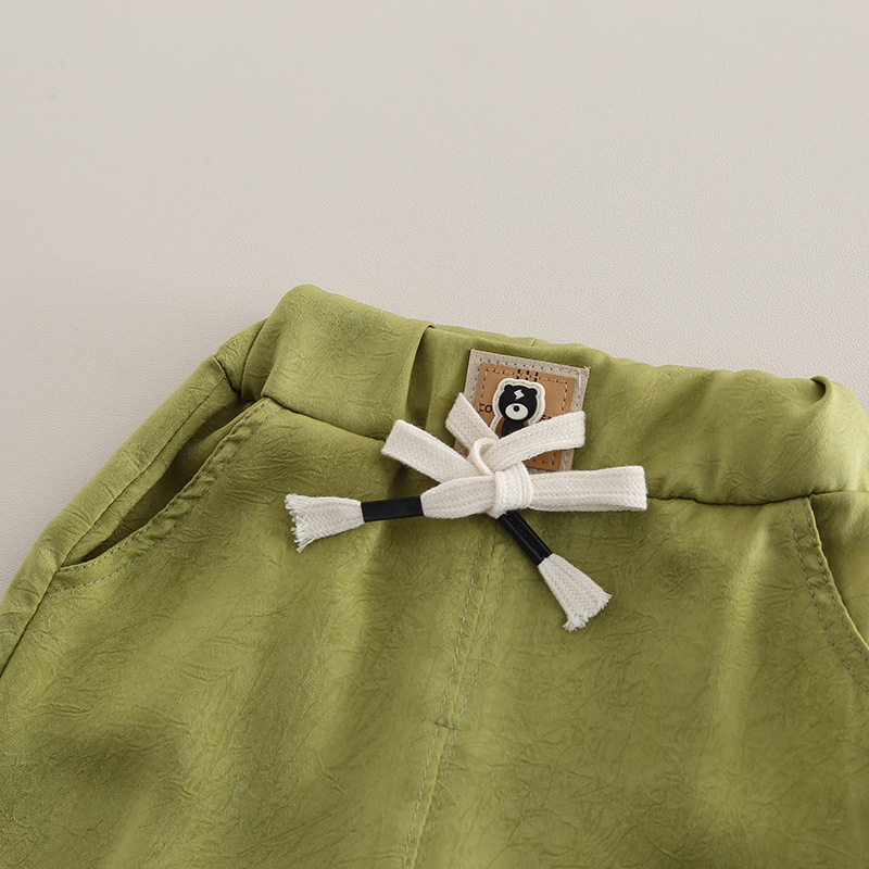 – Pantaloni lungi din material impermeabil, într-o nuanță proaspătă de verde. Prevăzuți cu talie elastică și șnururi decorative cu ciucuri + benzi elastice la glezne pentru o potrivire confortabilă.