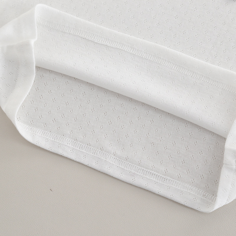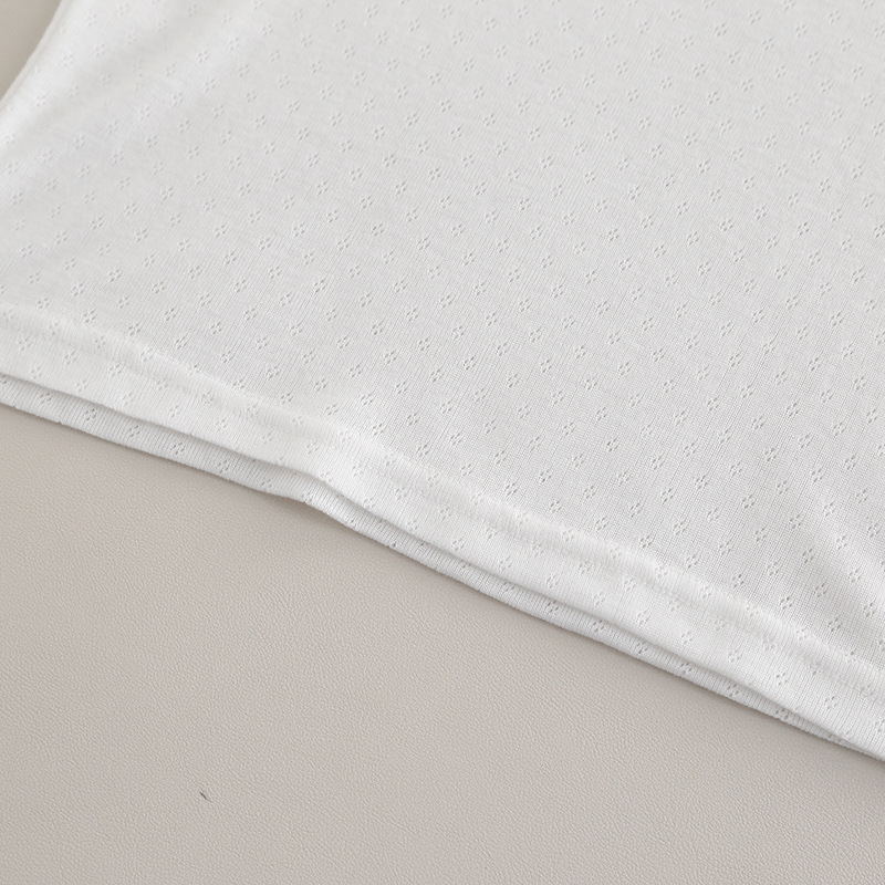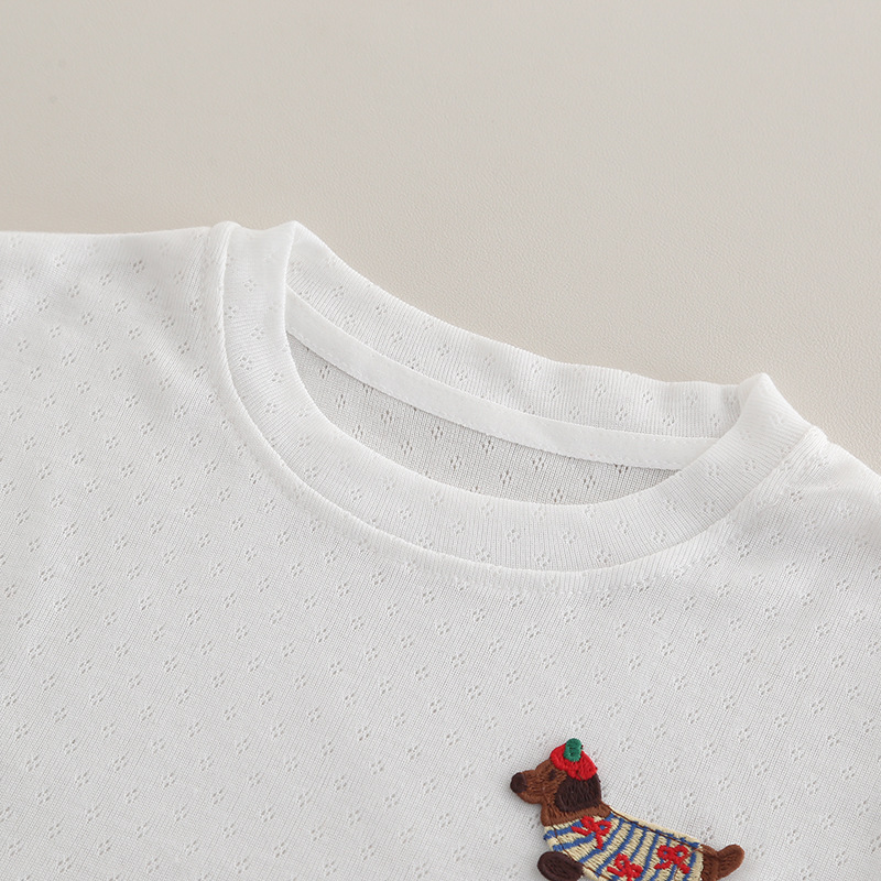 – Tricou cu mânecă scurtă, realizat din material subțire și respirabil cu puncte fine, în alb zăpadă. Model cu decolteu rotund și croială lejeră – ideal pentru vreme caldă. Decorat cu o broderie discretă pe o parte.