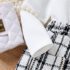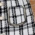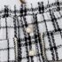 -Fustă mini din stofă bouclé de calitate superioară, într-un imprimeu la modă pentru sezon, cu talie elastică, două buzunare frontale conturate cu fir lucios și nasturi perlați aplicați, care disting modelul.