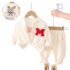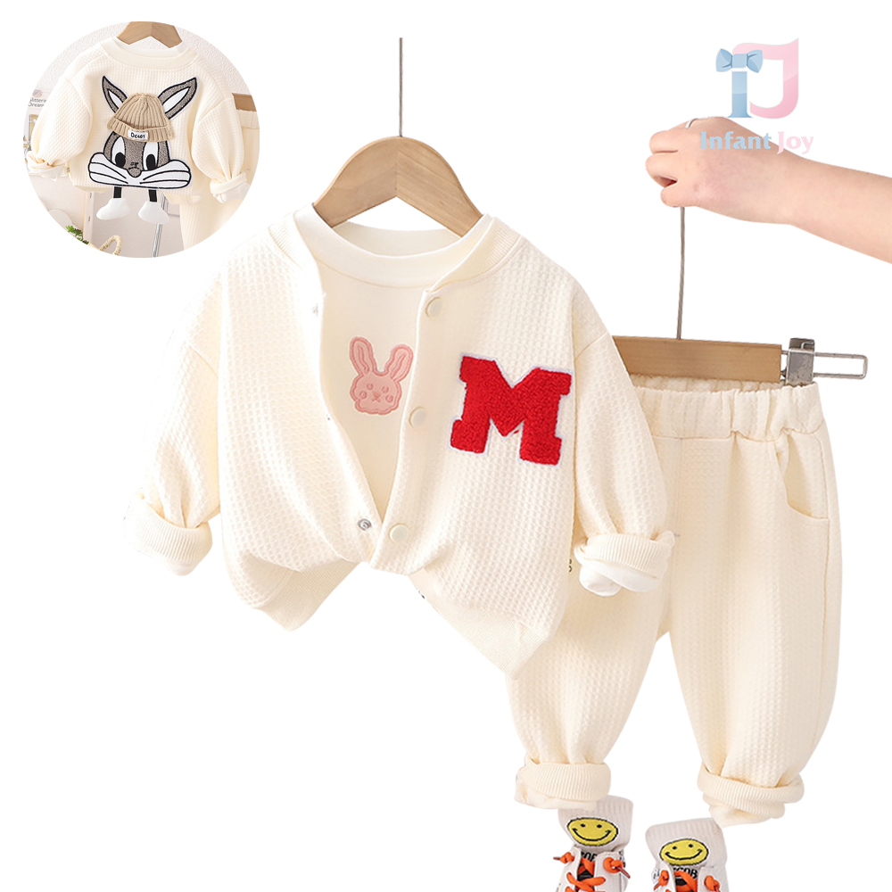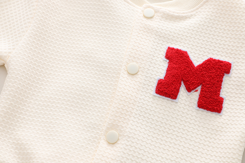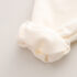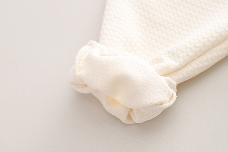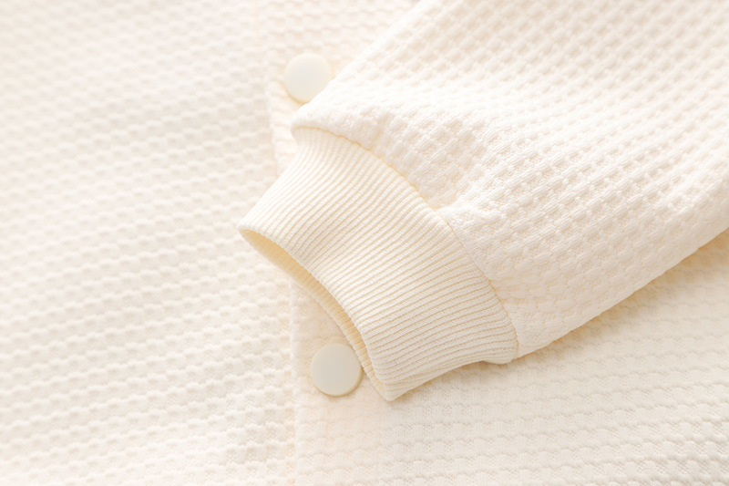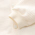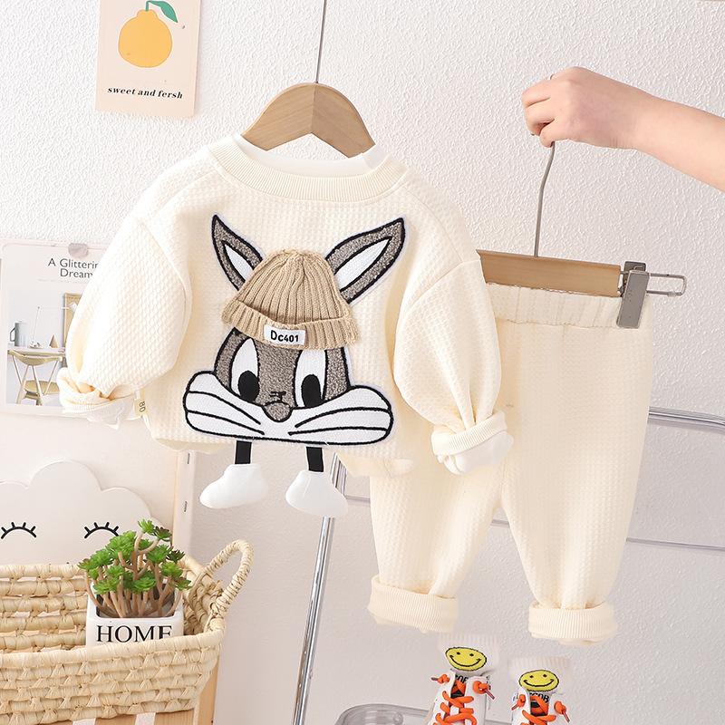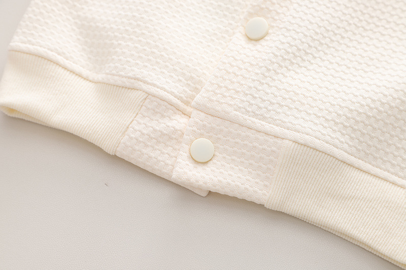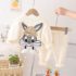 -Hanorac din material de înaltă calitate, cu efect texturat de tip vafă, în culoarea vanilie, cu o broderie 3D mare și distinctă pe spate, reprezentând un iepuraș cu o căciulă tricotată și literă brodată în partea din față.