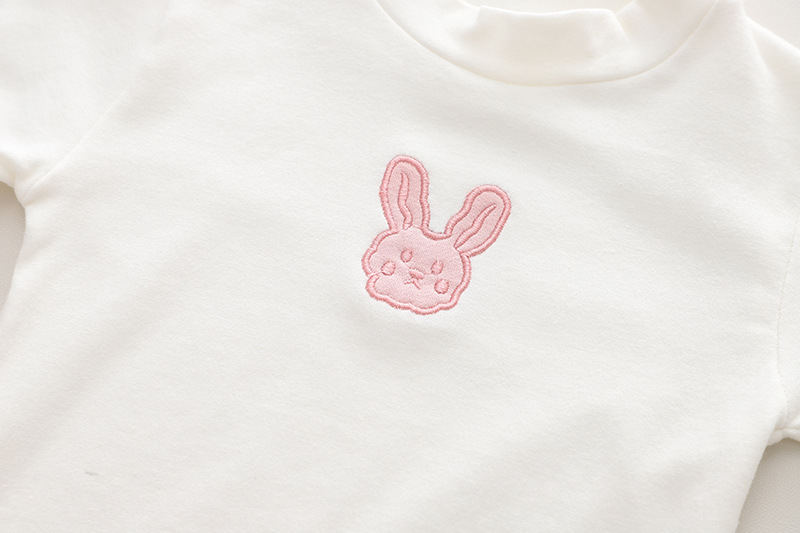 -Bluză albă cu guler înalt și broderie de iepuraș în față, realizată dintr-un material moale și elastic, pentru confort la îmbrăcare.