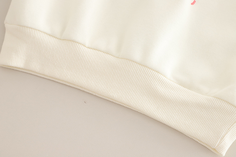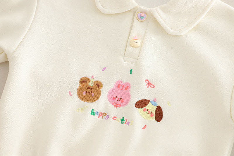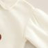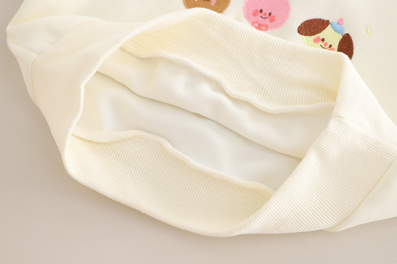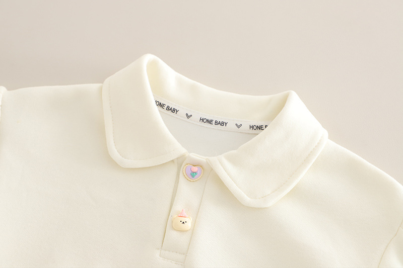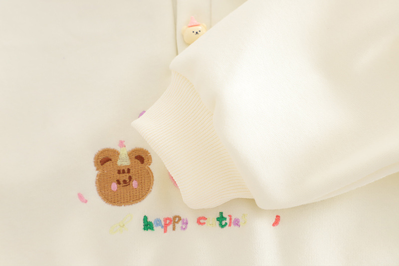 – Bluziță/sweatshirt din bumbac în nuanță ecru, cu croială lejeră. Modelul are guler, mâneci bufante și nasturi colorați. În față are broderii drăgălașe cu ursuleț, iepuraș și rățușcă, care oferă senzația unei îmbrățișări.