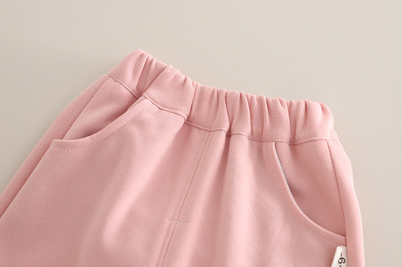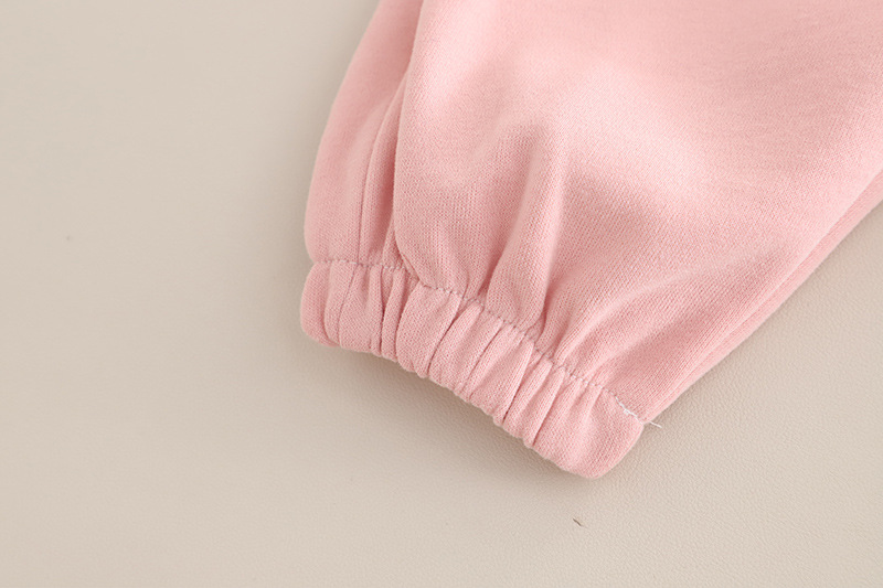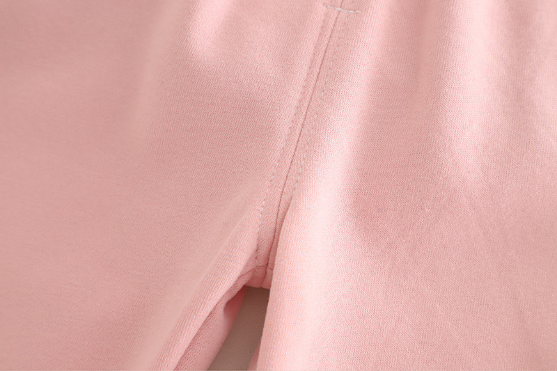 – Pantaloni în roz pal, din jersey moale, cu elastic în talie și la gleznă; croiala este lejeră și comodă, iar combinația de culori cu partea superioară este extrem de armonioasă.