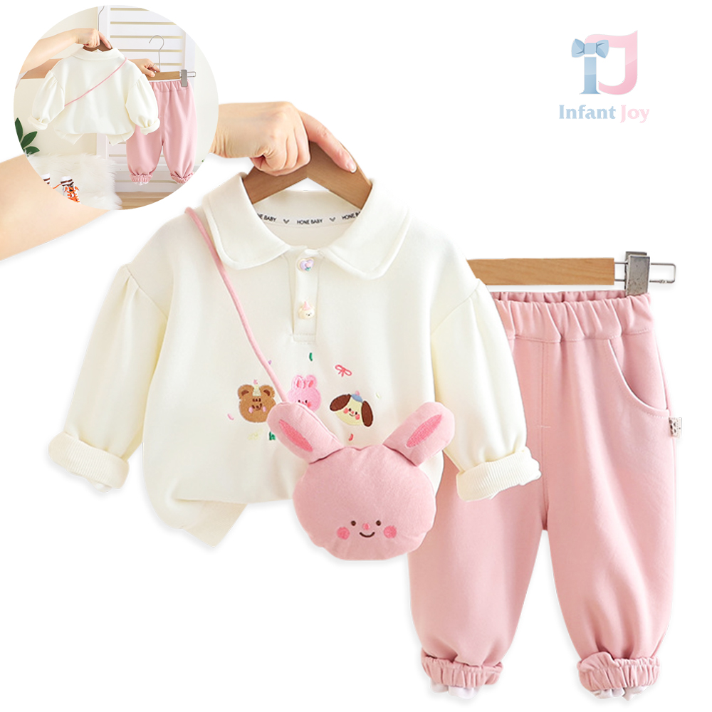 Set de 3 piese cu bluză/hanorac cu mâneci bufante, pantaloni și pandantiv 3D Fluffy Friends
