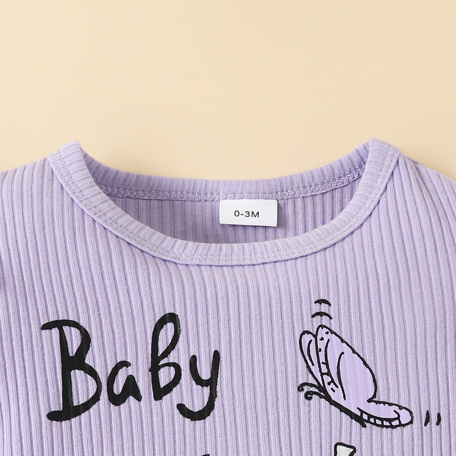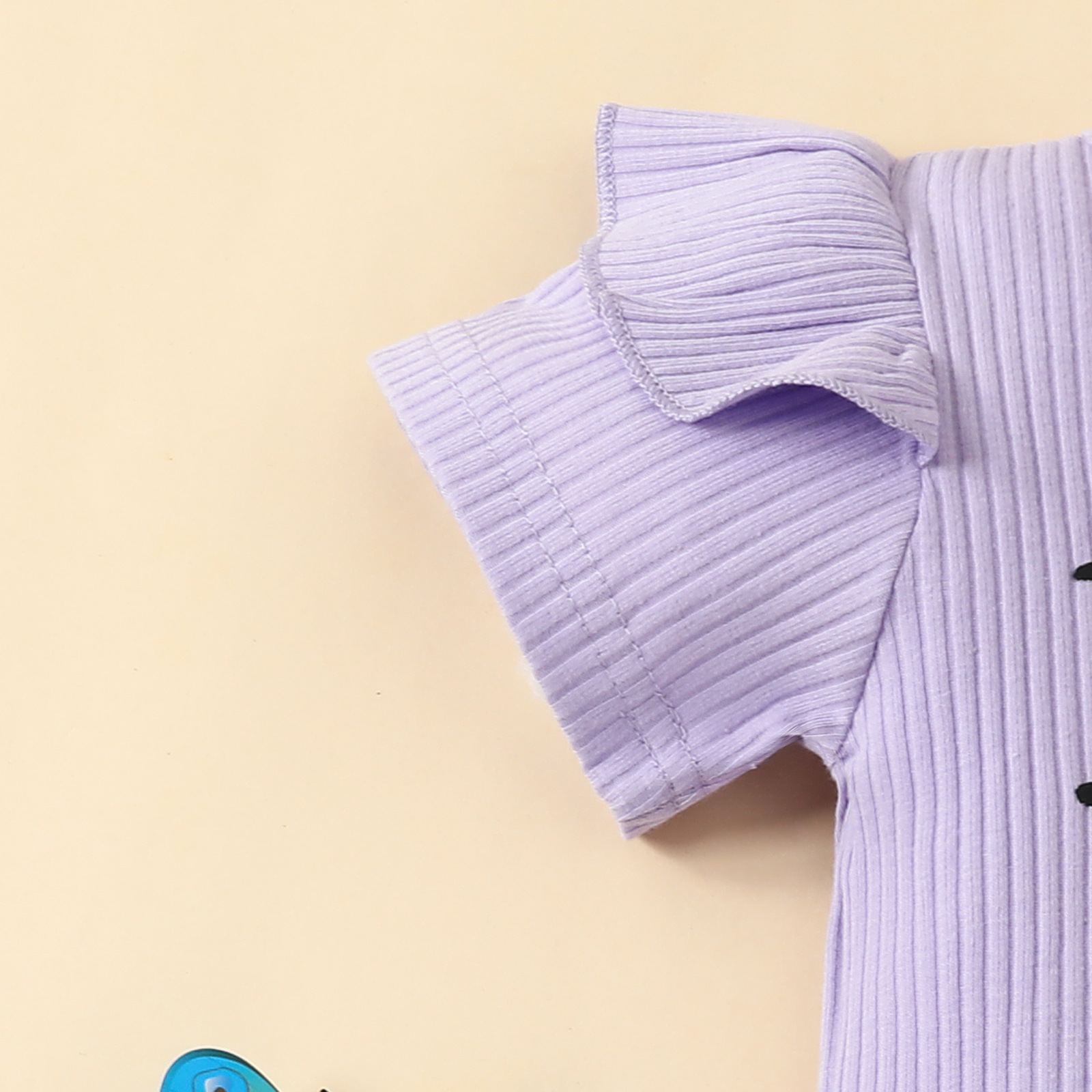 – Body moale, rib, de culoare mov. Model cu mânecă scurtă și volane pe umeri, efect „fluture” – pentru un look adorabil + imprimeu pe partea frontală. Închidere cu capse – pentru îmbrăcare ușoară.