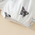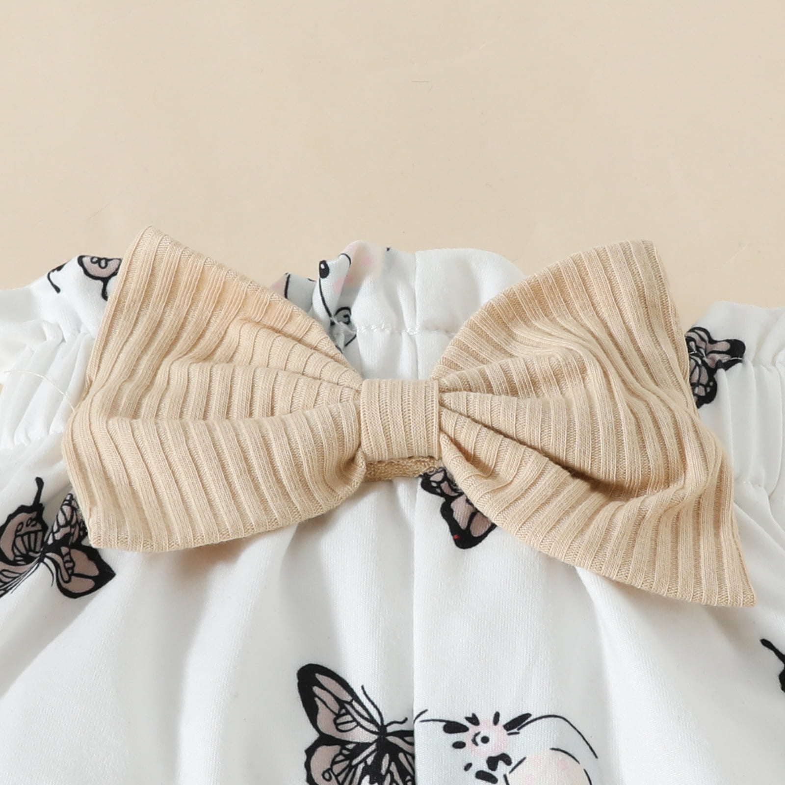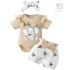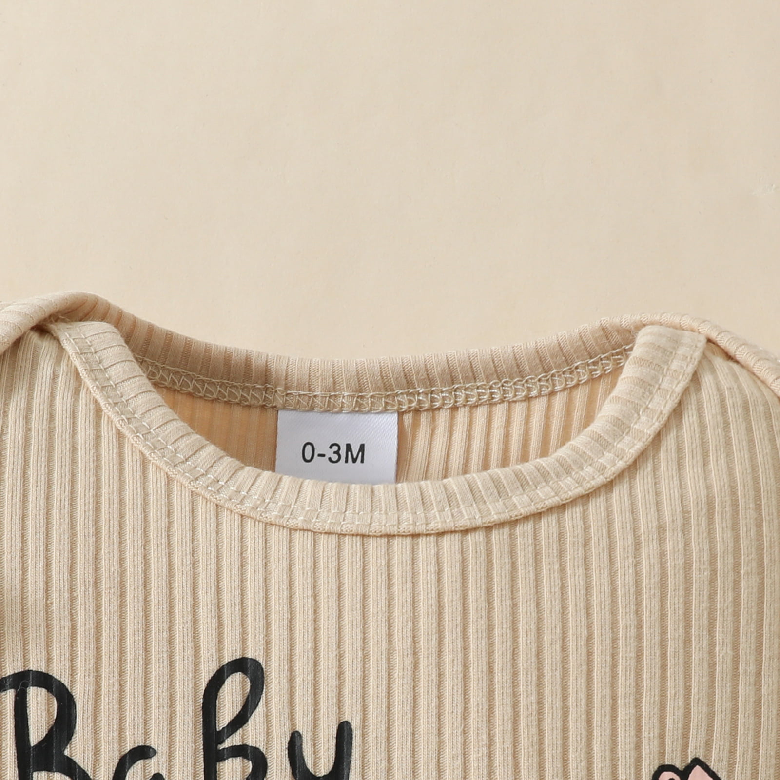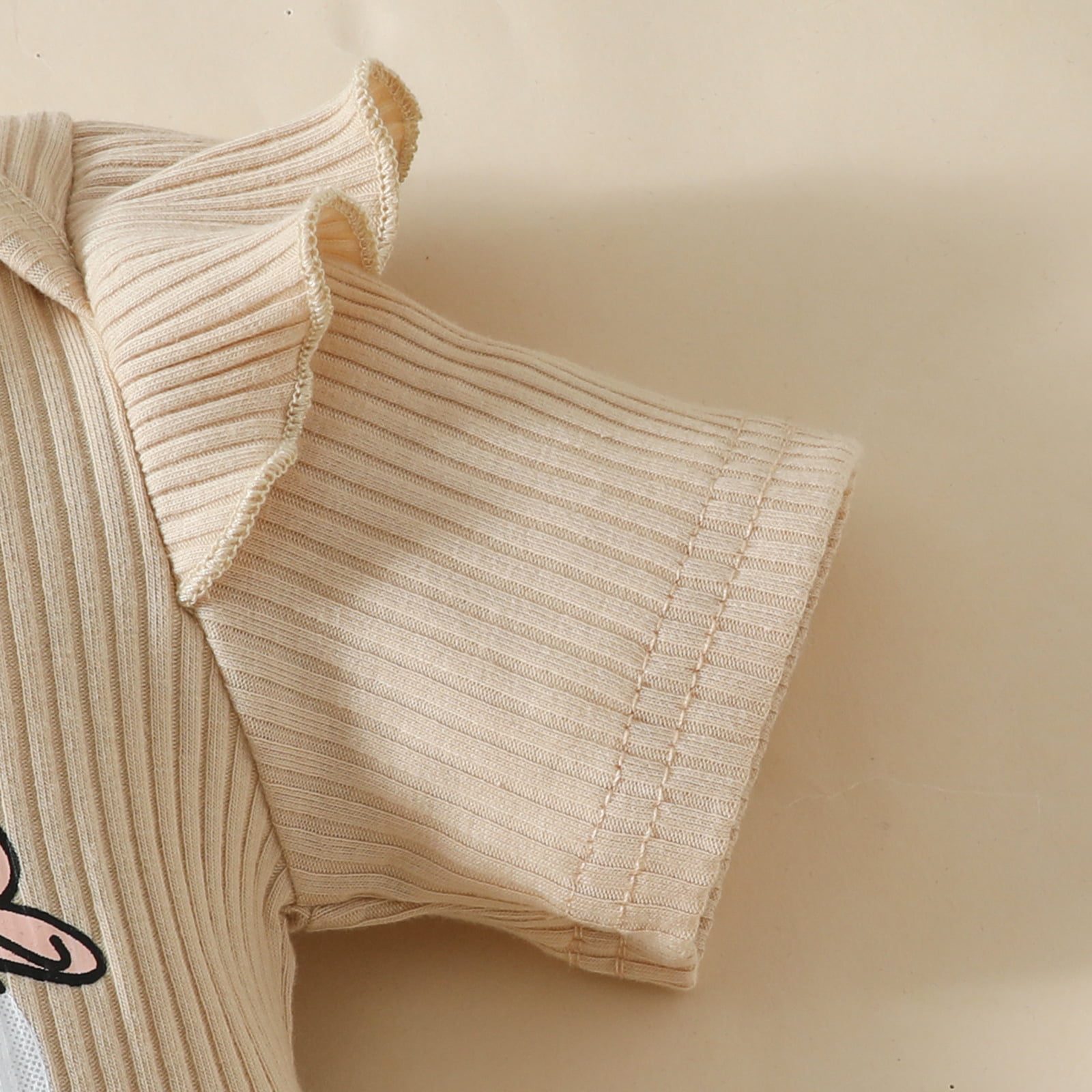 – Body moale, din material rib, de culoare bej, cu mâneci scurte și volănașe tip „fluture” pe umeri pentru un look adorabil, plus imprimeu pe față. Închidere cu capse pentru îmbrăcare ușoară