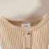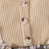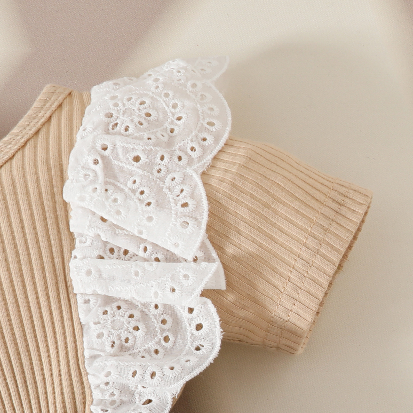 – Body din material rib moale, într-o nuanță caramel. Model cu mânecă scurtă și volănașe delicate din dantelă brodată din bumbac pe umeri, care oferă lejeritate și un farmec feminin. Decorat în față cu trei nasturi mici, pentru un accent elegant și finisat. Se închide cu capse în partea de jos, pentru o schimbare ușoară a scutecului.