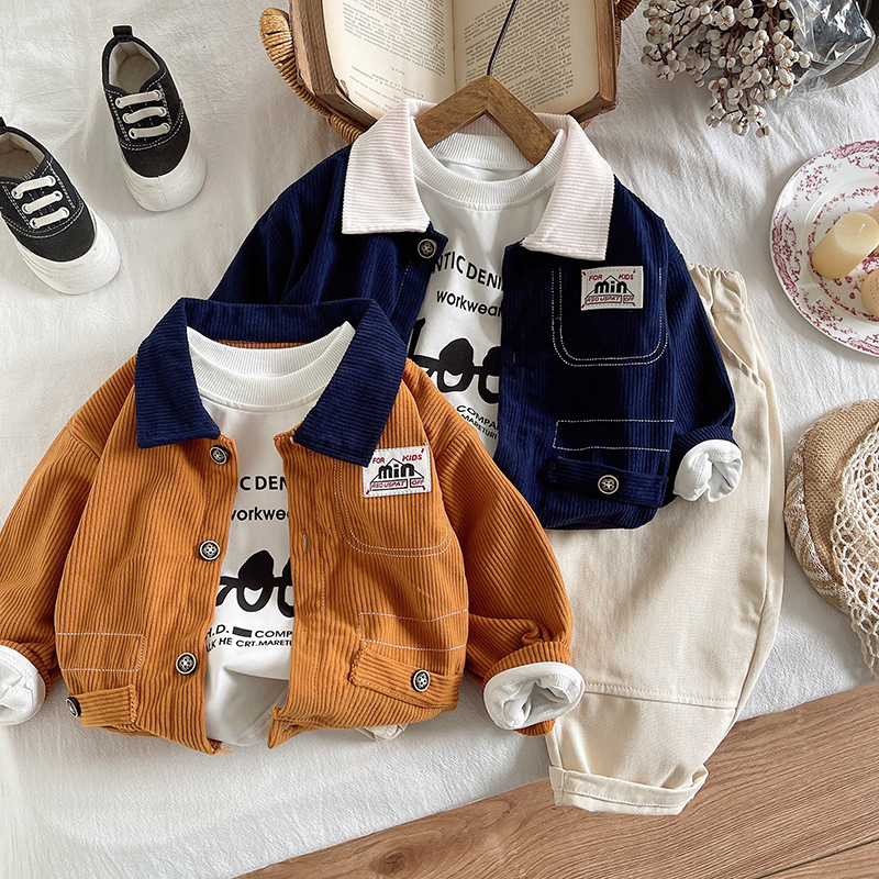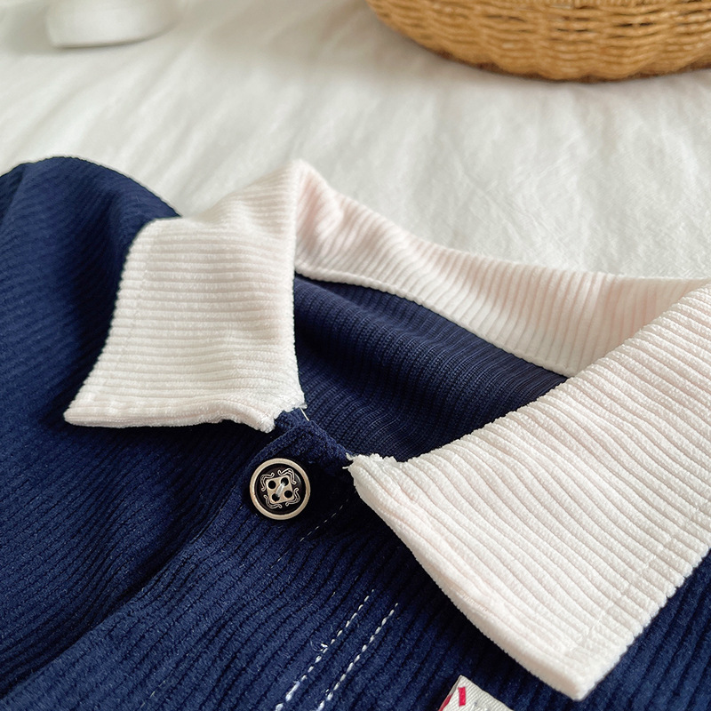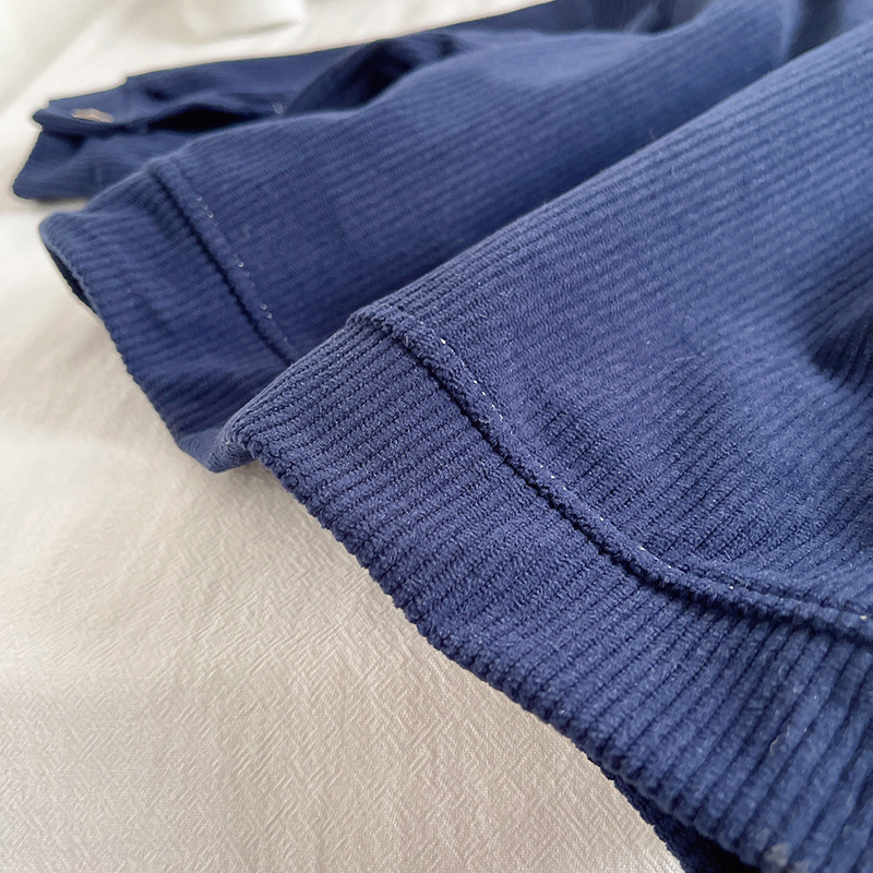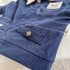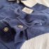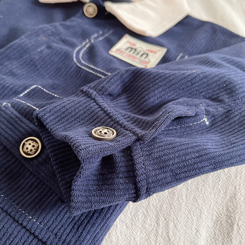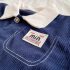 – Geacă-bomber din denim de culoare albastru închis, cu guler contrastant vanilie, închidere cu nasturi, două buzunare frontale și emblemă brodată mică pe o parte.