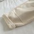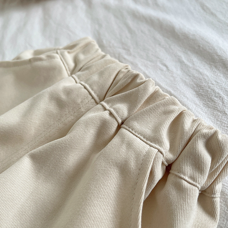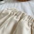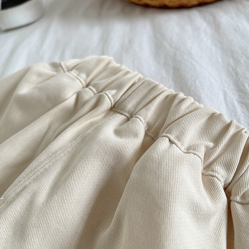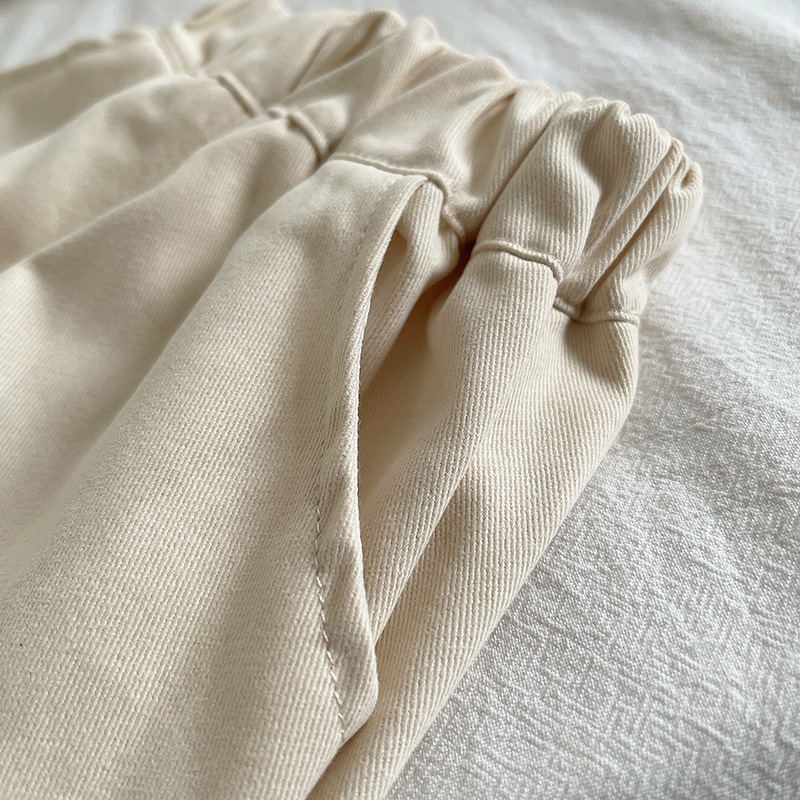 – Pantaloni crem din material moale de bumbac, cu talie elastică pentru încălțare rapidă, două buzunare laterale și tiv drept pentru un siluet curat.