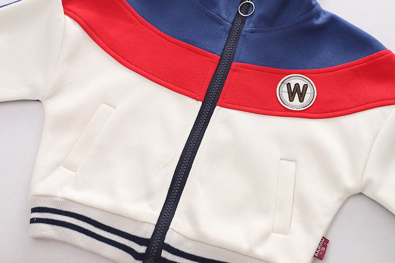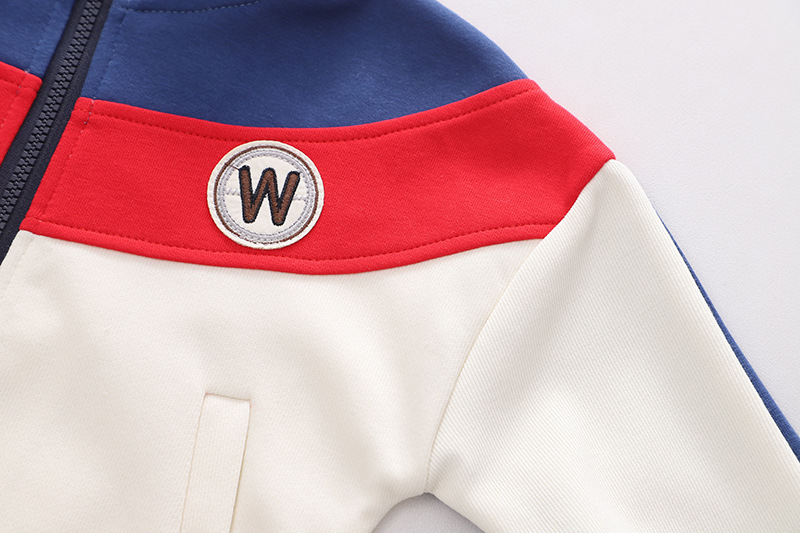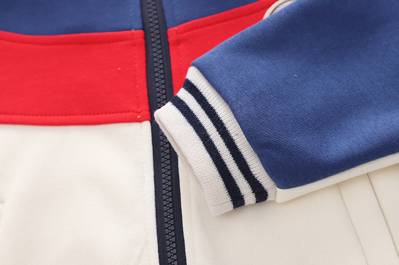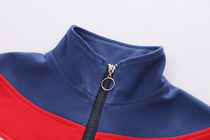 -Jachetă bomber cu guler înalt, în combinație de culori (vanilie, roșu și albastru închis), cu închidere completă în față cu fermoar. Emblemă adăugată și manșete elastice.
