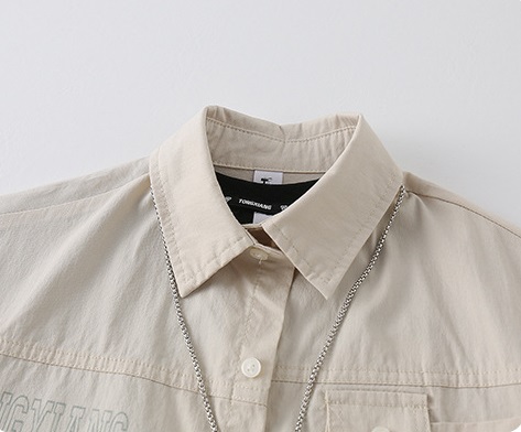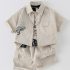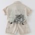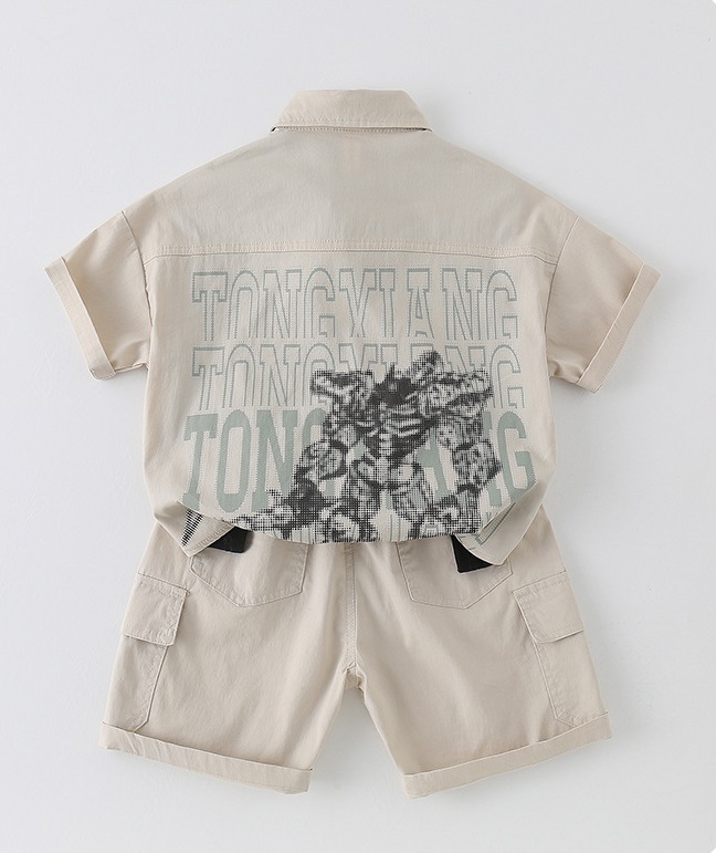-Cămașă bej cu mânecă scurtă, realizată din material moale și ușor, cu croială lejeră și buzunar la piept. Model cu guler clasic și închidere completă cu nasturi pentru îmbrăcare facilă. Pe o parte are un imprimeu cu dinozaur și texte care oferă personalitate și originalitate. Poate fi purtată deschisă peste maiou sau ca jachetă de vară.