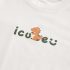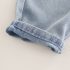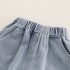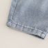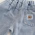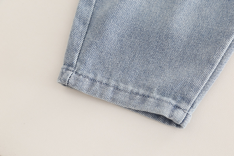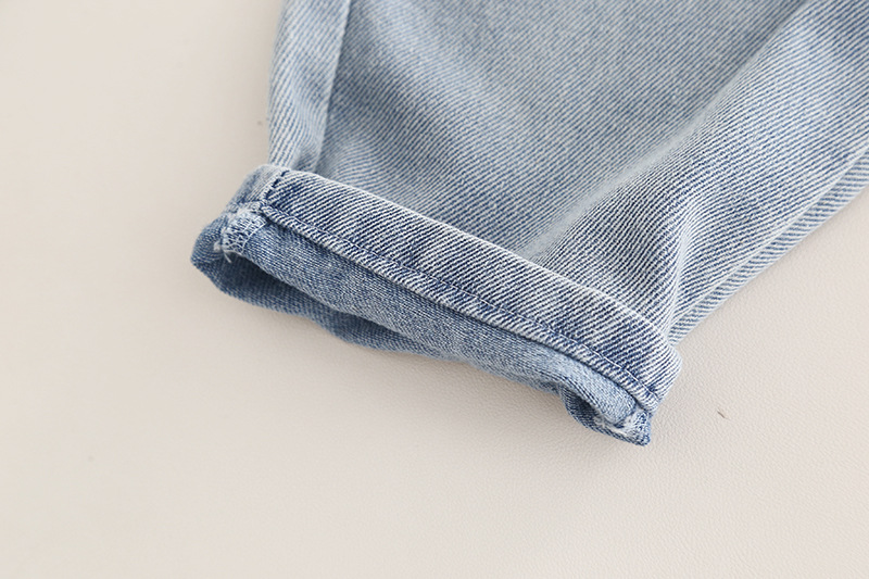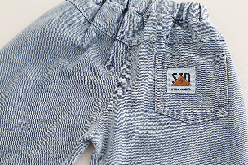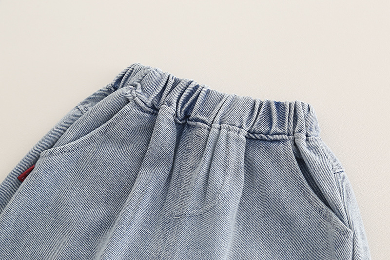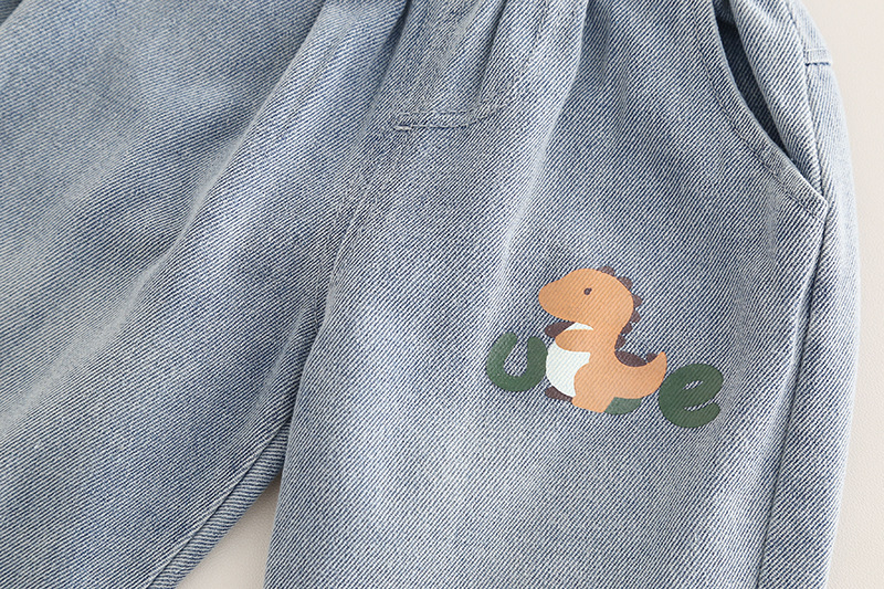 – Pantaloni din denim albastru mediu, cu talie elastică pentru îmbrăcare ușoară și două buzunare laterale. Manșete suflecate, decorate cu o aplicație cu dinozaur și o inscripție.
